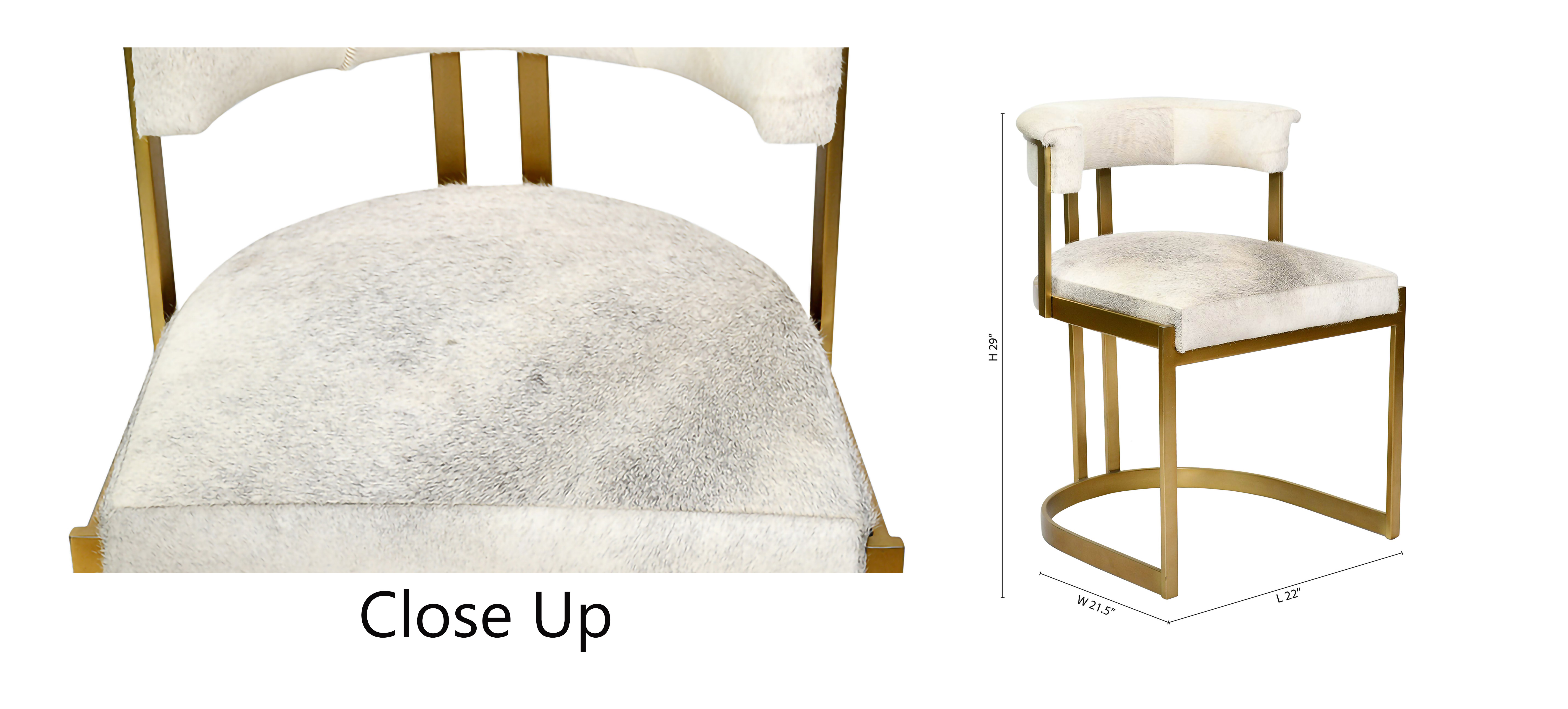 A GOLD STAINLESS STEEL CHAIR WITH GREY HAIRLINE LEATHER SEATS