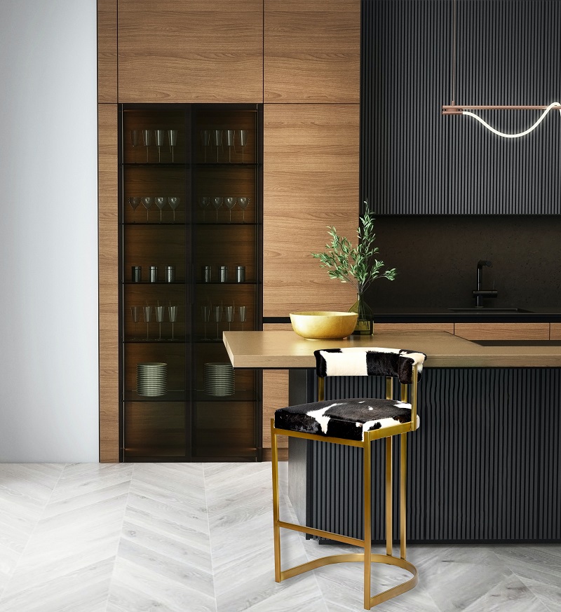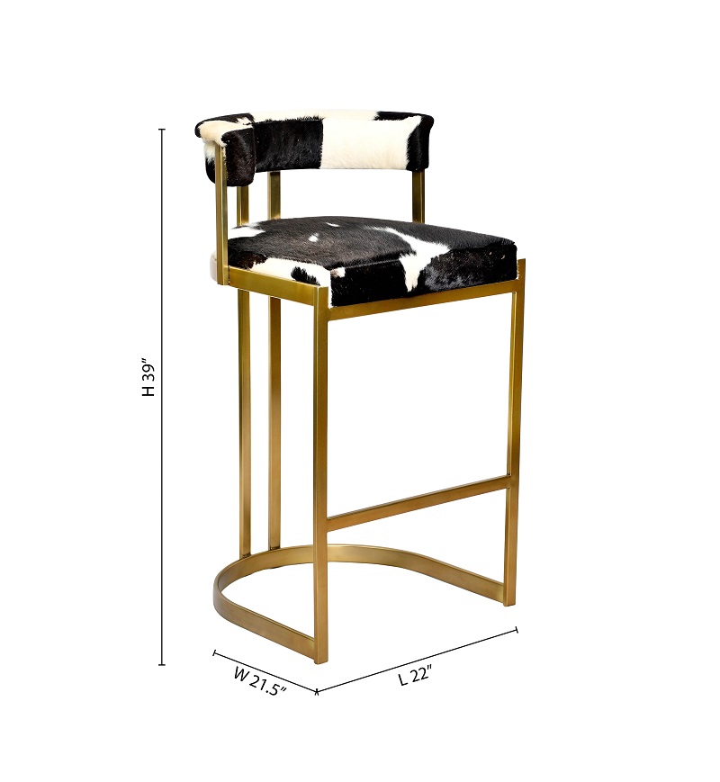 A GOLD STAINLESS STEEL FRAME HIGH CHAIR WITH BLACK & WHITE HAIRLINE LEATHER