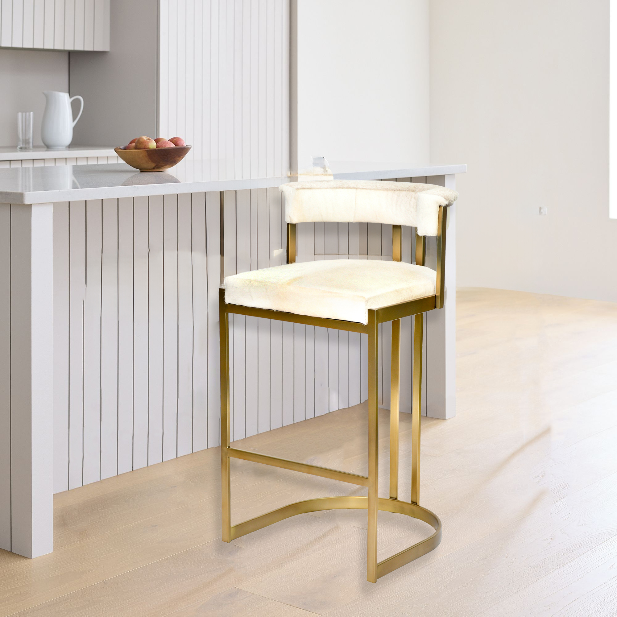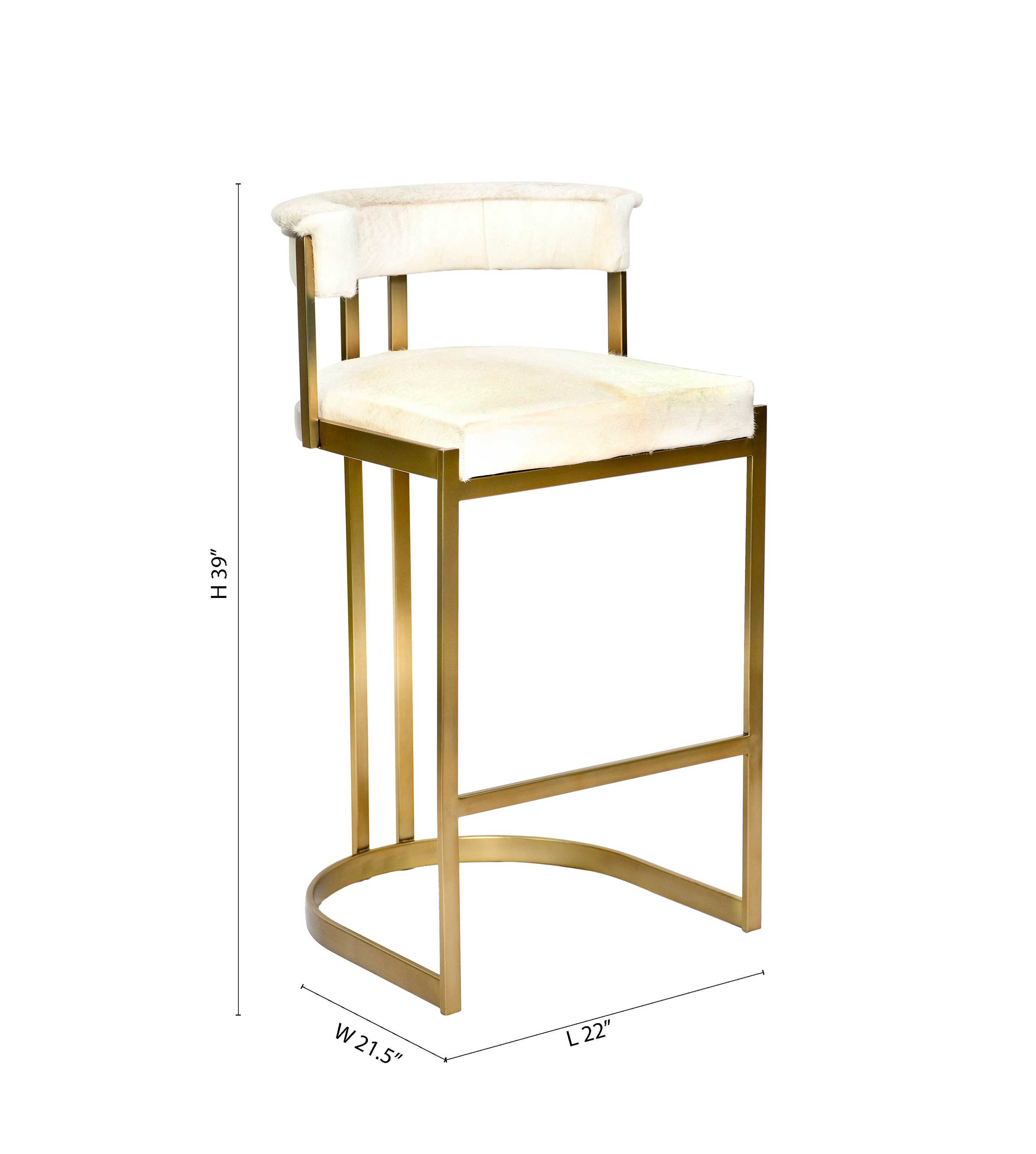 A GOLD STAINLESS STEEL FRAME HIGH CHAIR WITH GREY HAIRLINE LEATHER