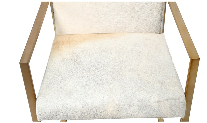 A GOLD STAINLESS STEEL FRAME CHAIR WITH A GREY HAIRLINE LEATHER SEAT