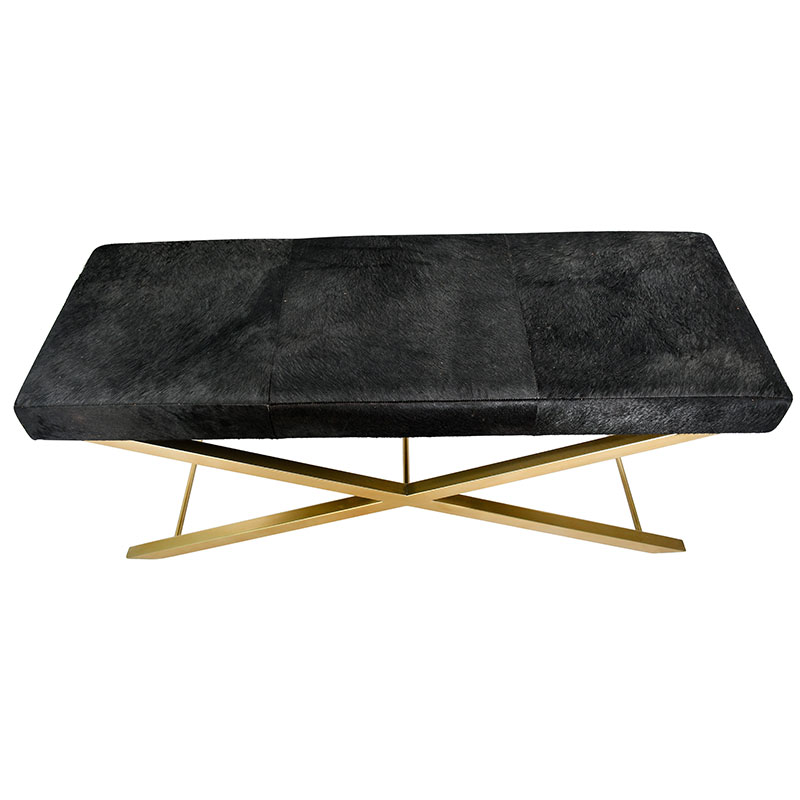 A GOLD STAINLESS STEEL FRAME BENCH WITH A SOLID BLACK HAIRLINE LEATHER