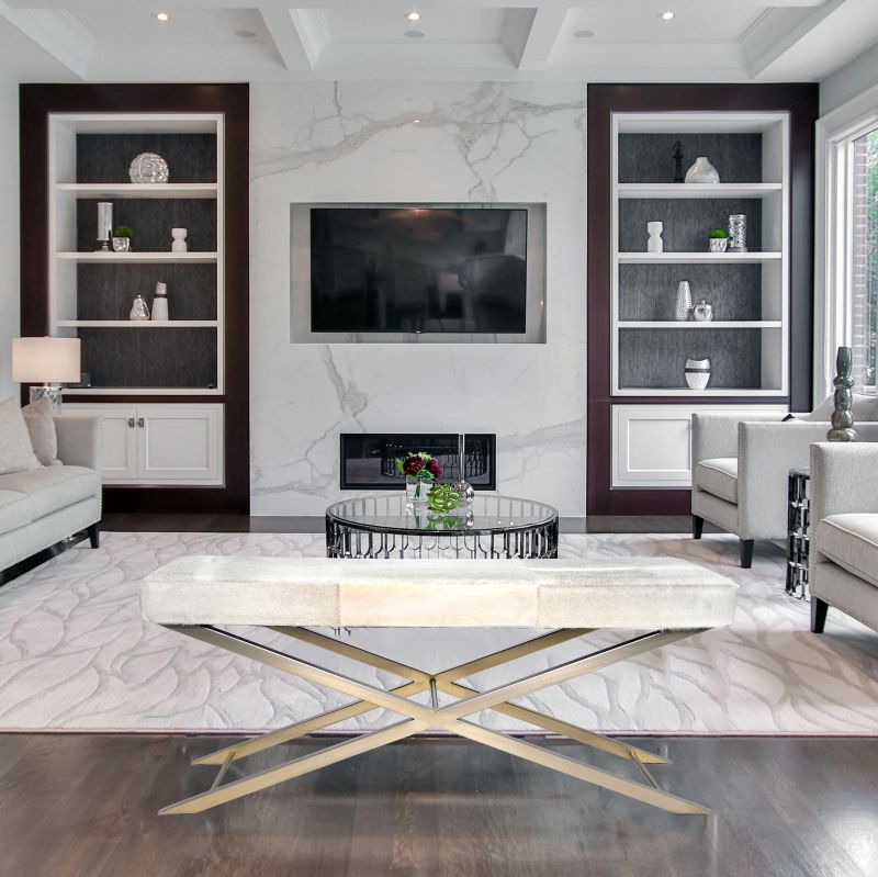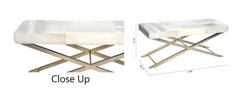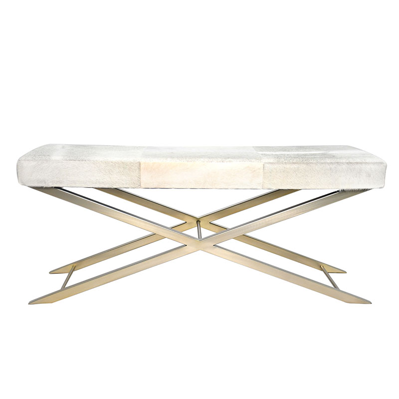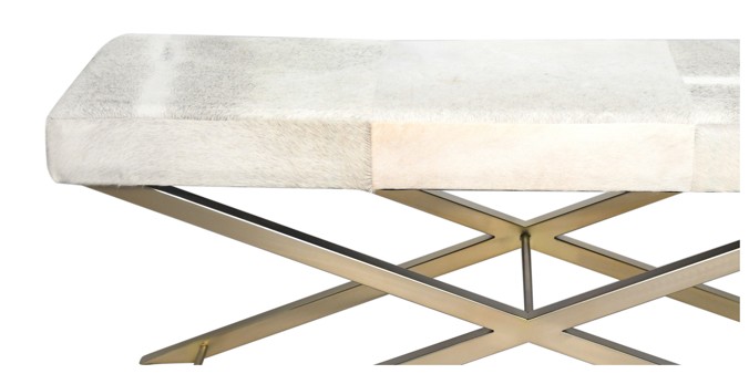 A GOLD STAINLESS STEEL FRAME BENCH WITH GREY & WHITE HAIRLINE LEATHER