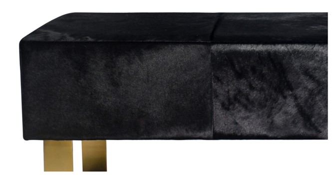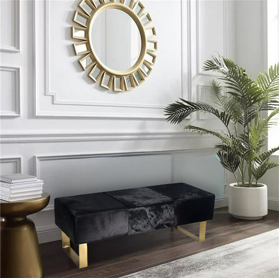 A GOLD STAINLESS STEEL FRAME BENCH WITH BLACK HAIRLINE LEATHER