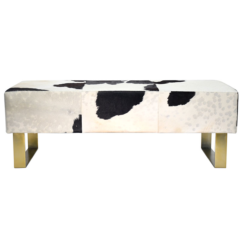 A GOLD STAINLESS STEEL BENCH WITH BLACK & WHITE HAIRLINE LEATHER