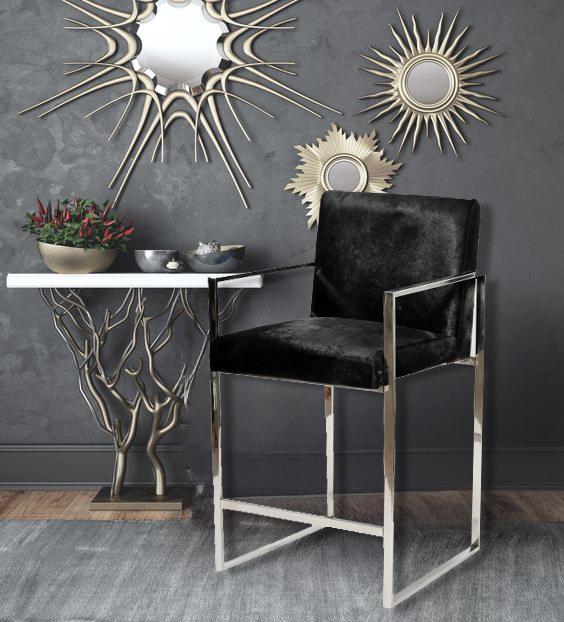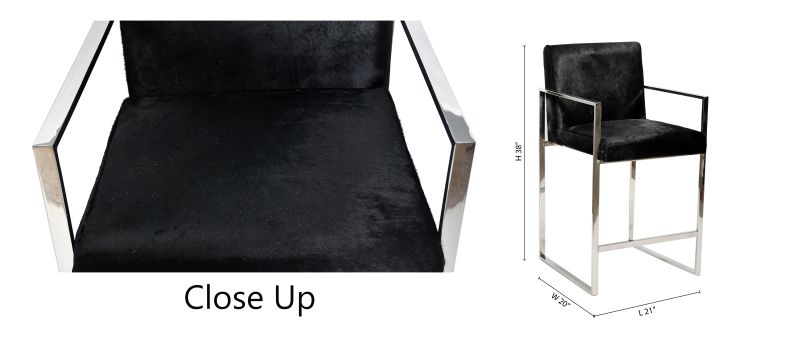 A CHROME STAINLESS STEEL COUNTER STOOL CHAIR WITH SOLID BLACK HAIRLINE LEATHER