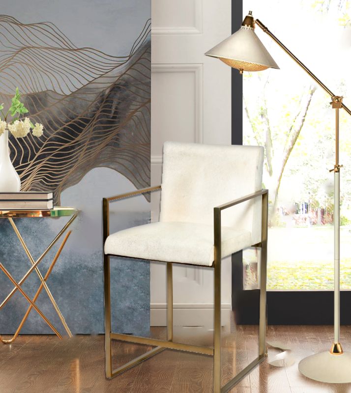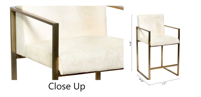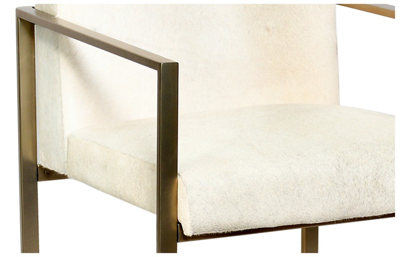 A GOLD STAINLESS STEEL FRAME CHAIR WITH GREY HAIRLINE LEATHER