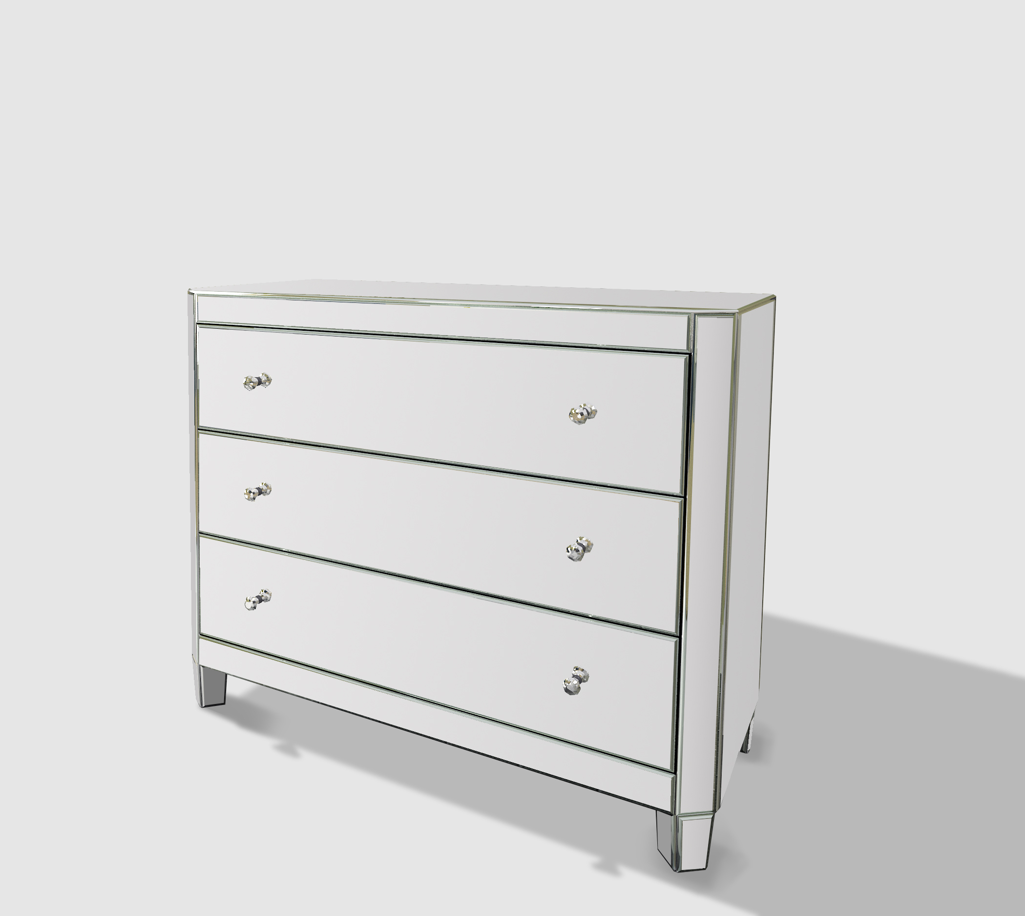 A MIRROR THREE DRAWER CHEST SIDE TABLE WITH CLEAR CRYSTAL KNOBS AND A WOOD INTERIOR