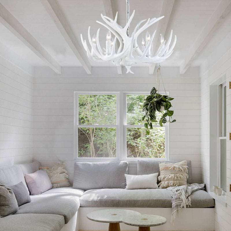 This antler chandelier is a unique and eye-catching lighting fixture that adds a touch of rustic charm to any room. Measuring 26.7 inches in diameter and 15.7 inches in height, this lamp features a white antler polyresin design that provides a natural and organic look. The 6xE12 sockets (Bulbs Not Included) can accommodate up to 60W of light, making it perfect for illuminating a small to medium-sized area. With its rustic design and warm glow, this lamp is a great choice for adding a touch of country charm to a foyer, living room, dinning room, or entryway.