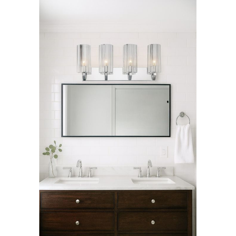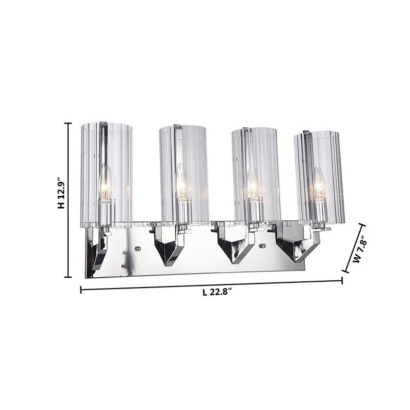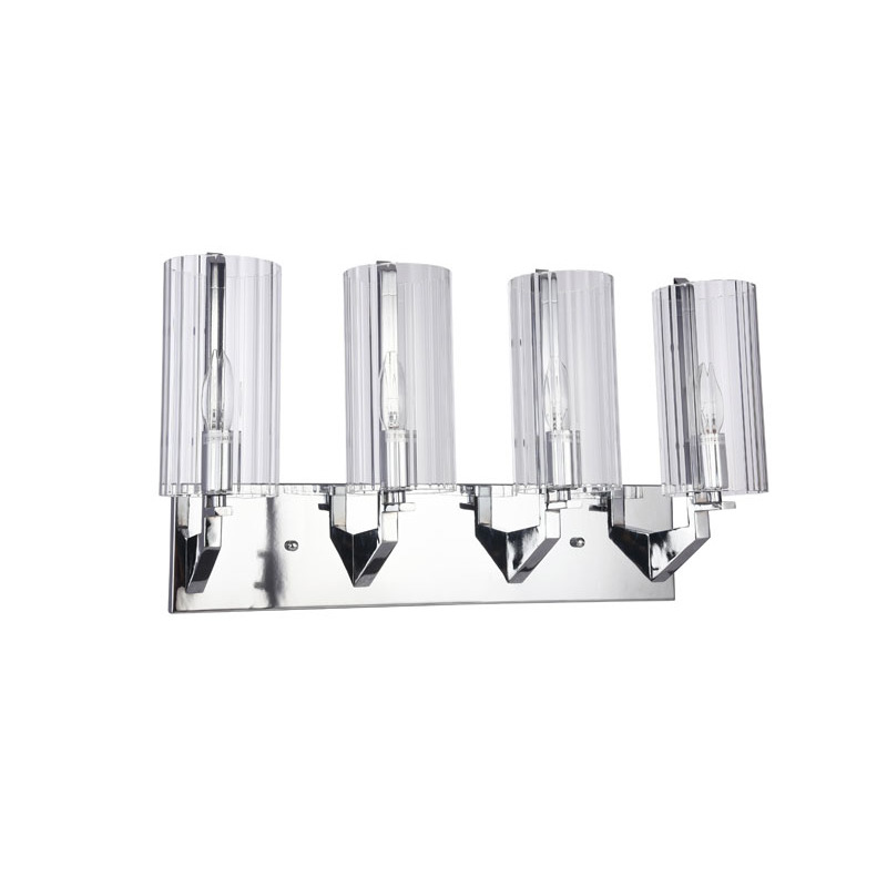 A CHROME FRAME FOUR LIGHT WALL SCONCE WITH CLEAR GLASS CYLINDER SHADES