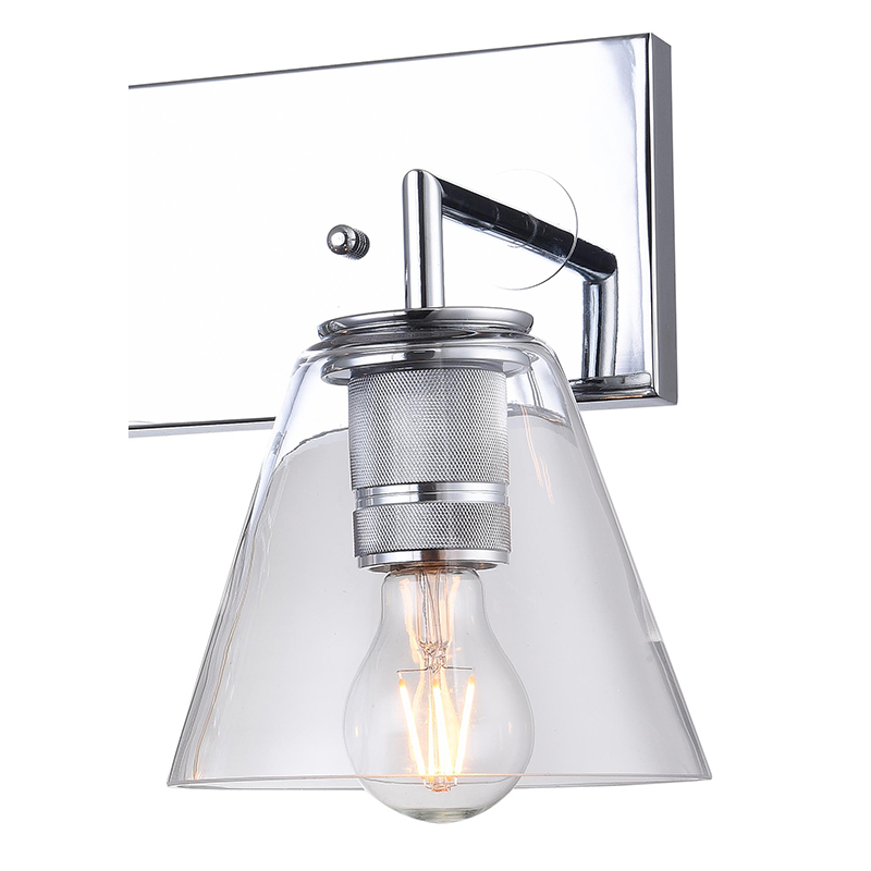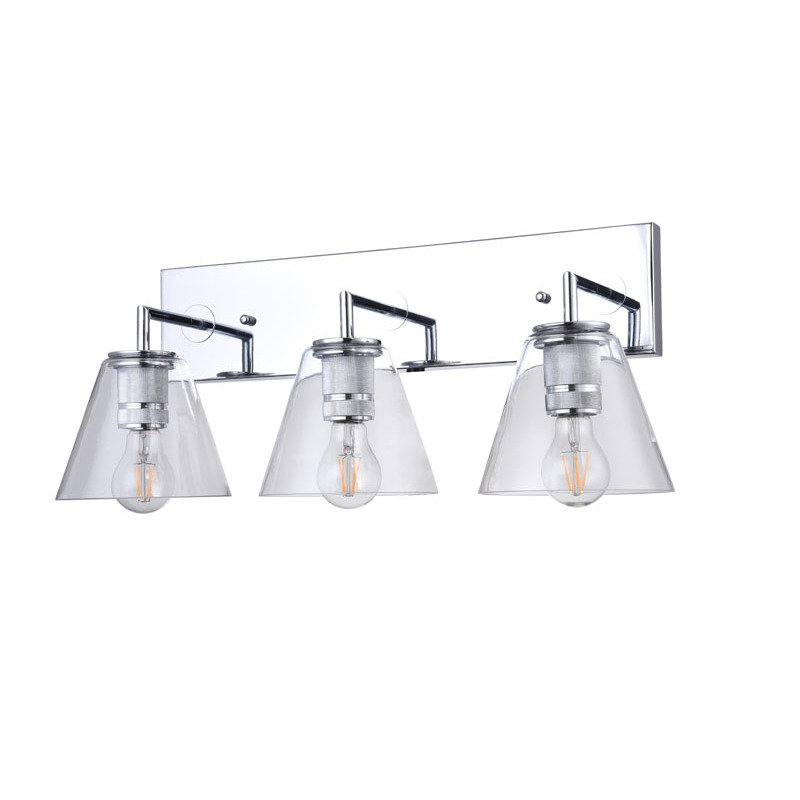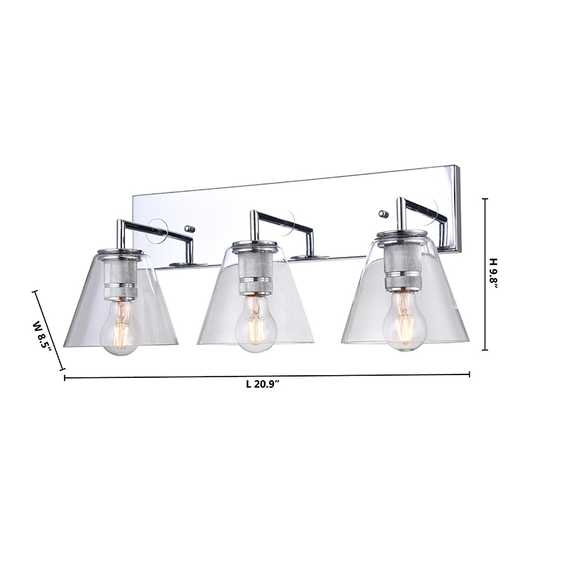 A CHROME FRAME THREE LIGHT WALL SCONCE WITH CLEAR GLASS CONE SHADES