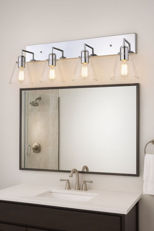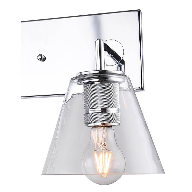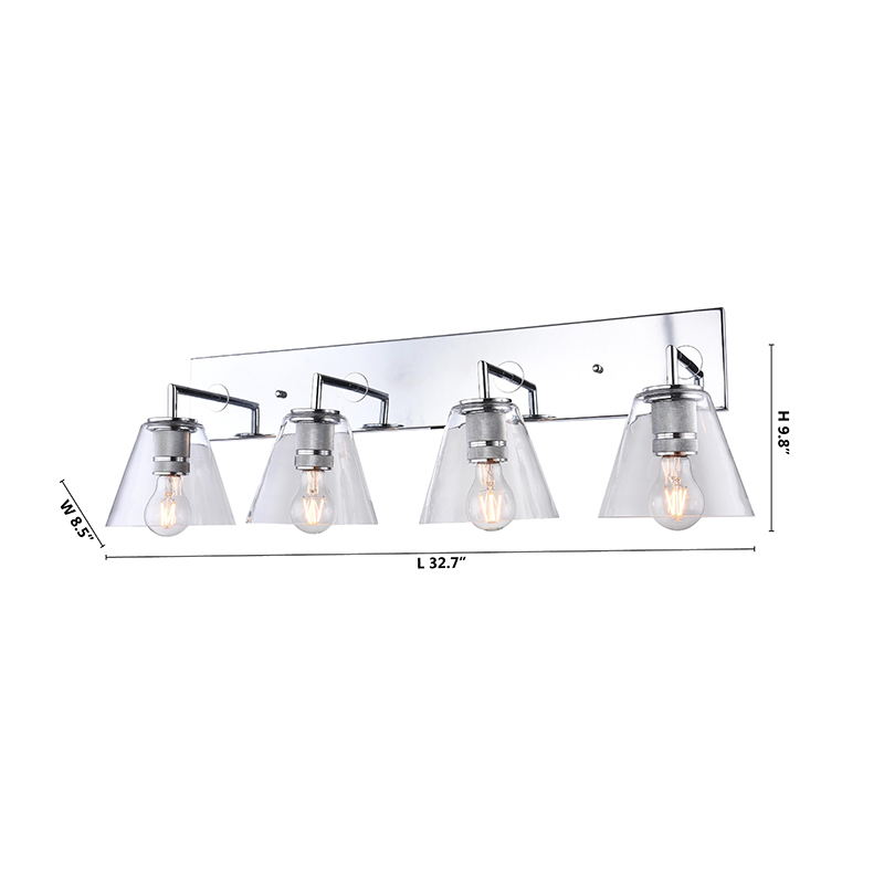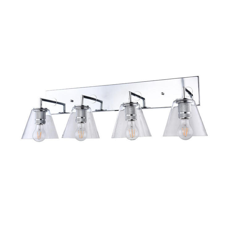 A CHROME FRAME FOUR LIGHT WALL SCONCE WITH CLEAR GLASS CONE SHADES