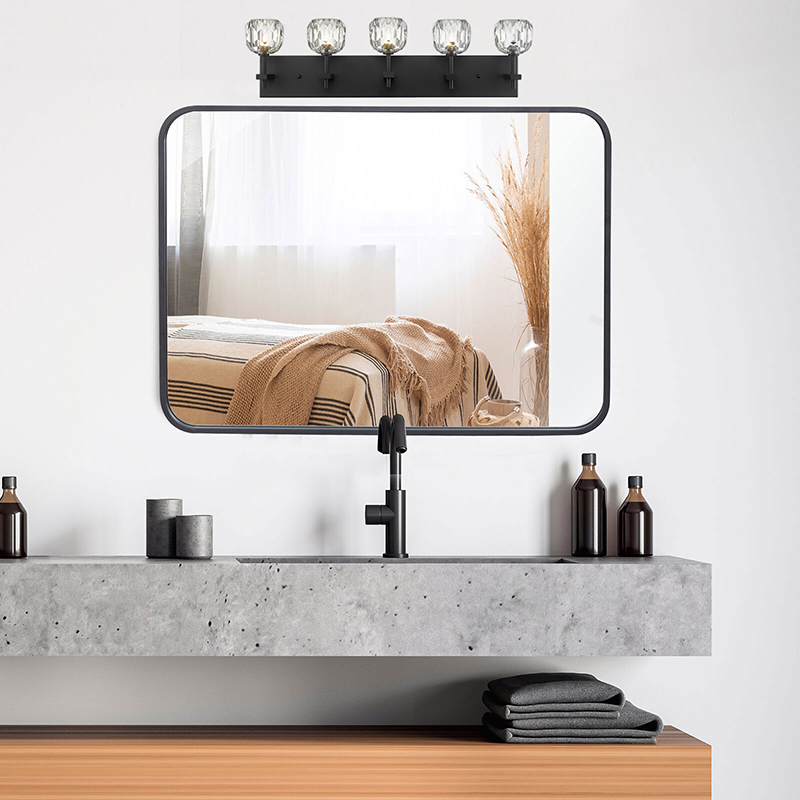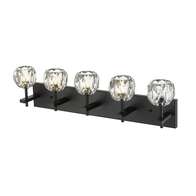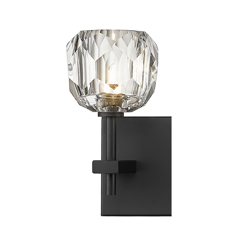 A BLACK FRAME WALL SCONCE WITH CLEAR CRYSTAL SHADES