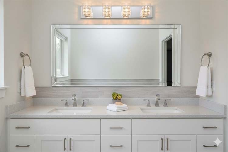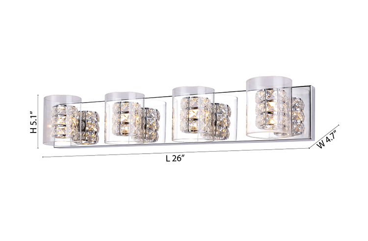 A CHROME FRAMED BATHROOM VANITY LIGHT WITH CLEAR GLASS & CRYSTAL SHADES