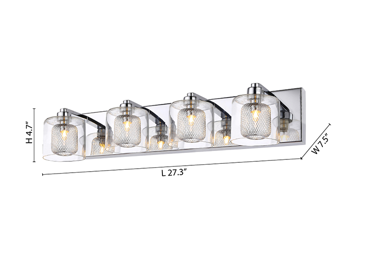 A BATHROOM VANITY LIGHT WITH GLASS SHADES, MESH METAL COVERS, AND CHROME HARDWARE
