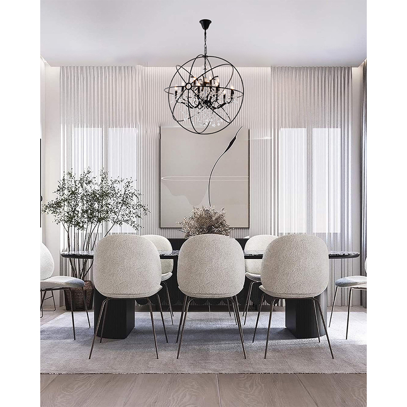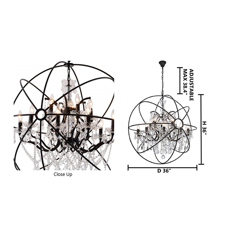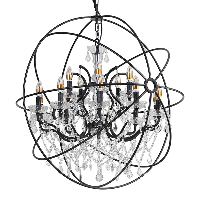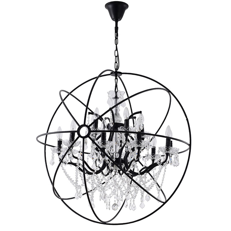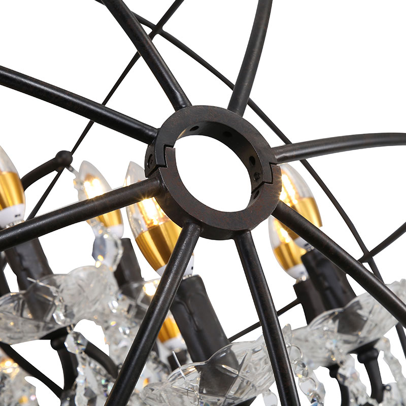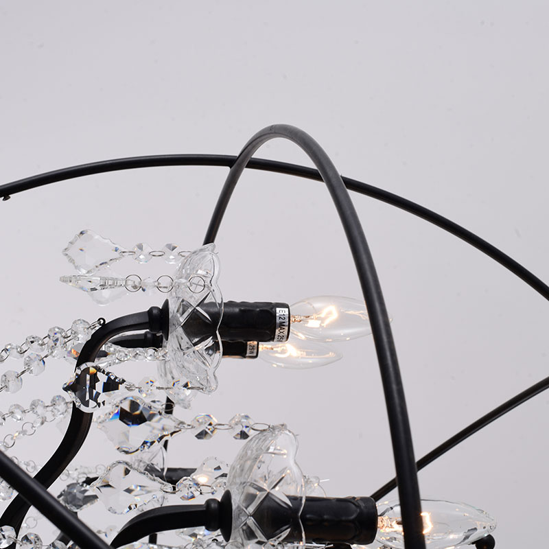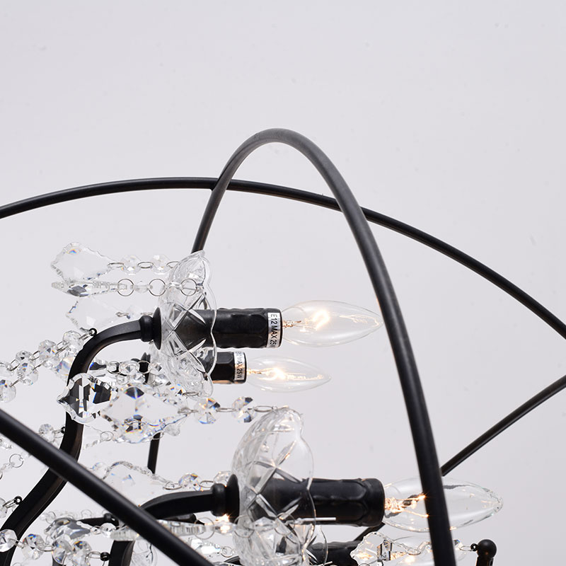 A BLACK CAGE CHANDELIER WITH CLEAR HANGING CRYSTALS