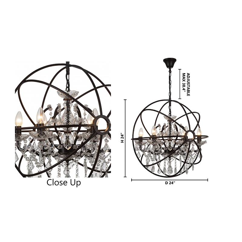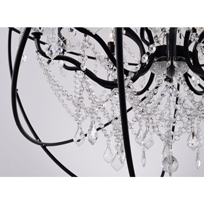 A BLACK CAGE CHANDELIER WITH CLEAR HANGING CRYSTALS