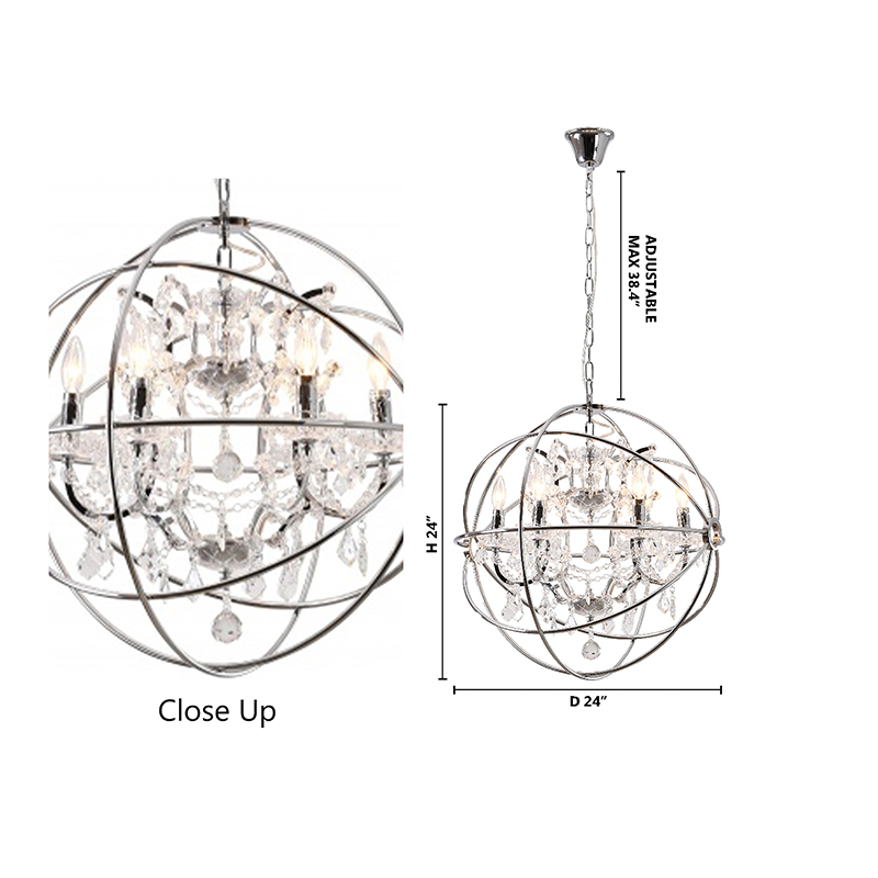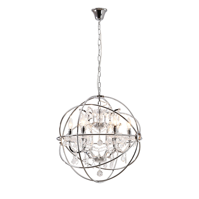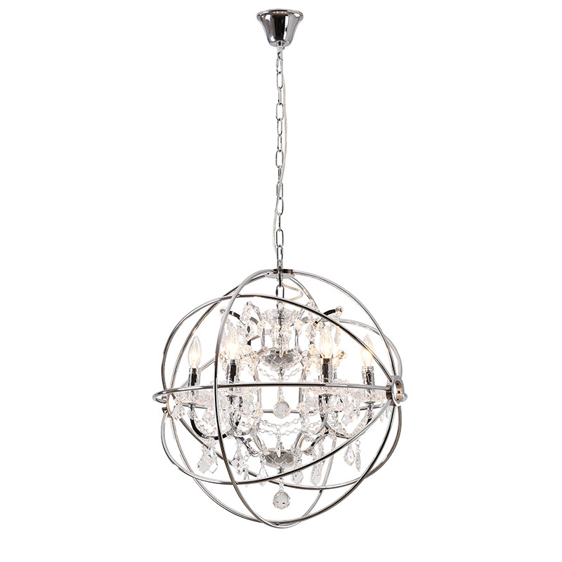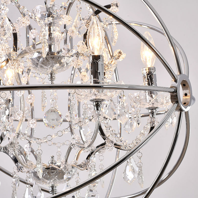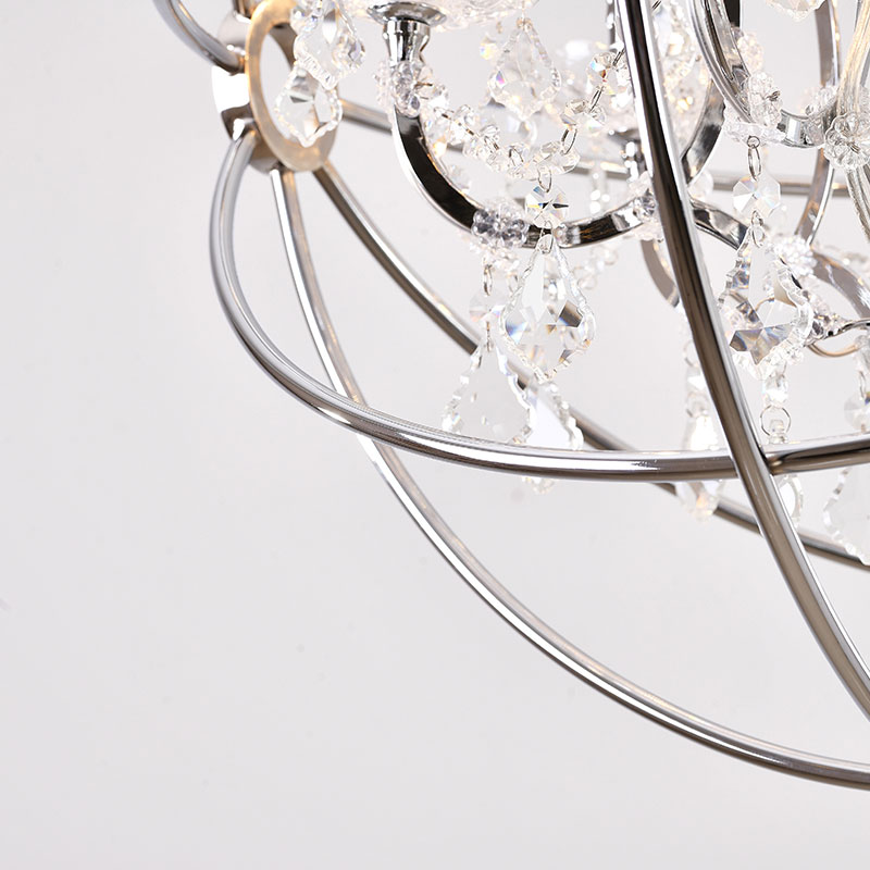 A CLEAR CRYSTAL CHANDELIER WITH CHROME HARDWARE AND CHROME CAGE FRAME