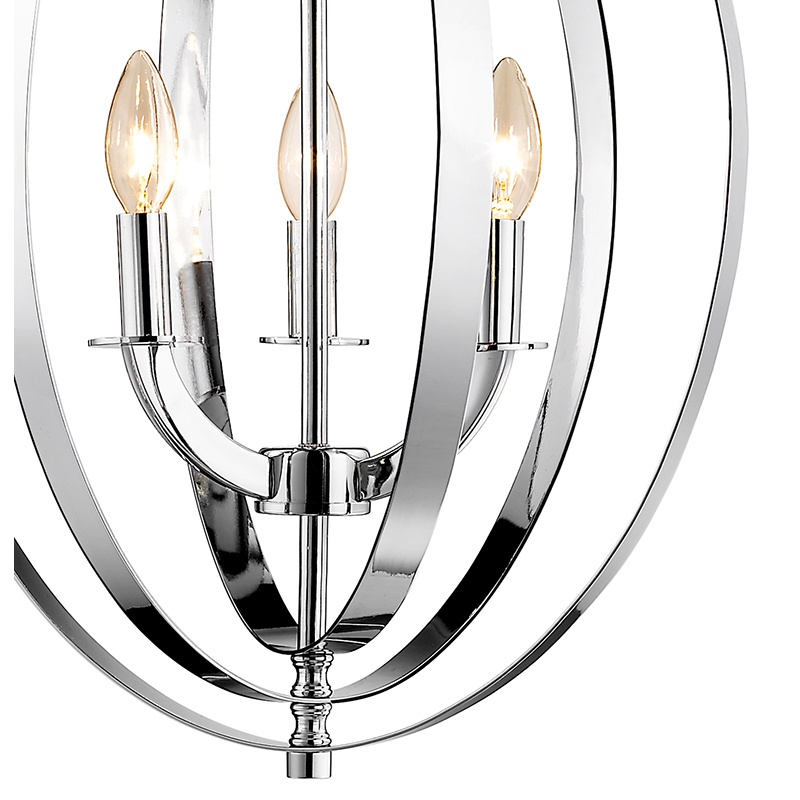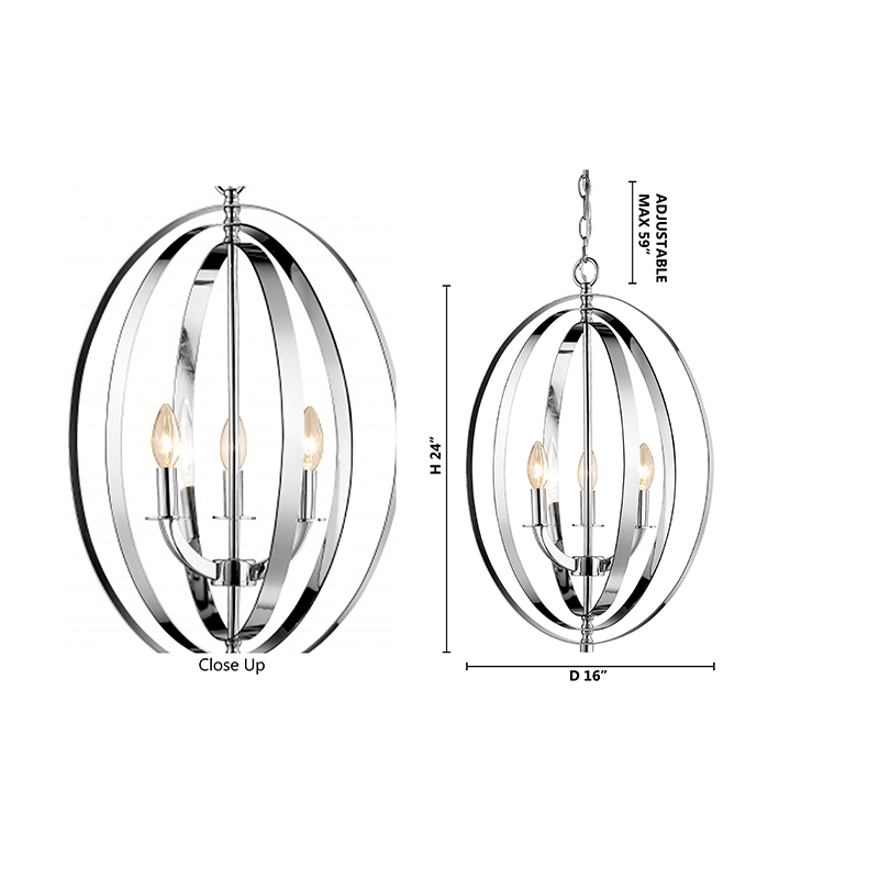 A CHROME OVAL ORB LIGHT FIXTURE WITH CANDLE LIGHT BULBS