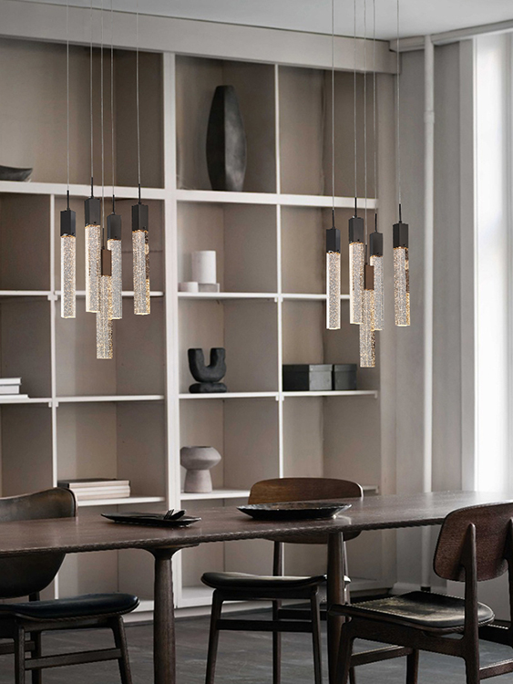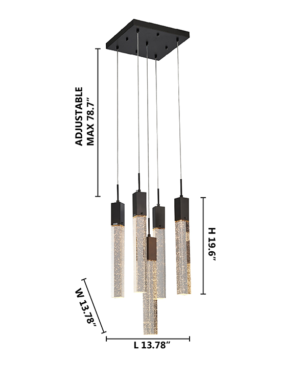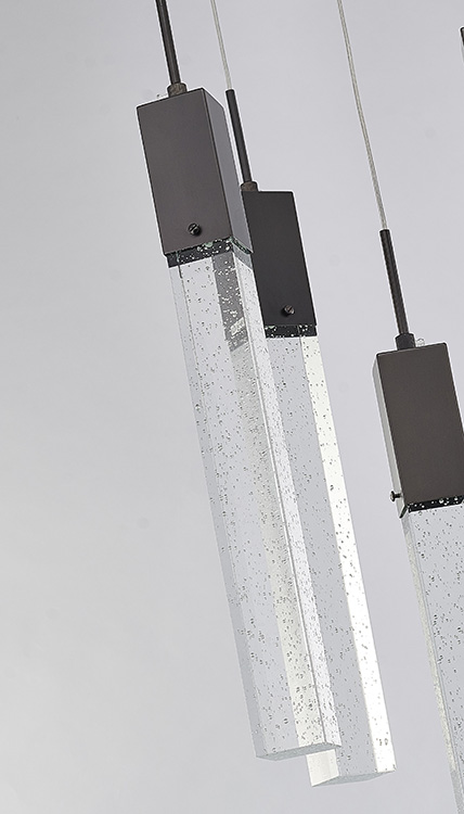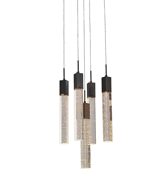 A FLUSHED BLACK GUN METAL FRAME CHANDELIER WITH HANGING CLEAR BUBBLE BLOCK CRYSTALS