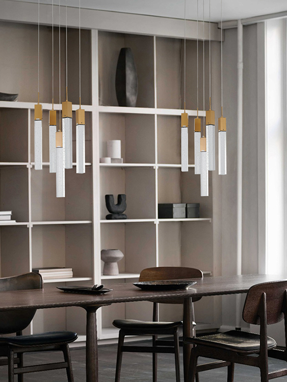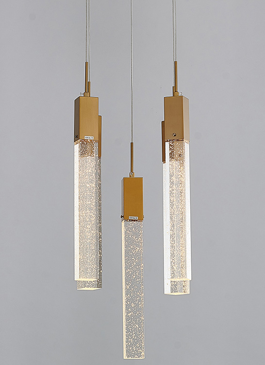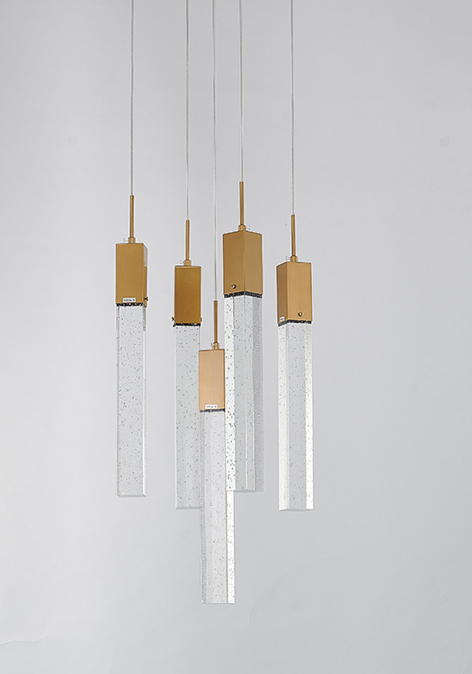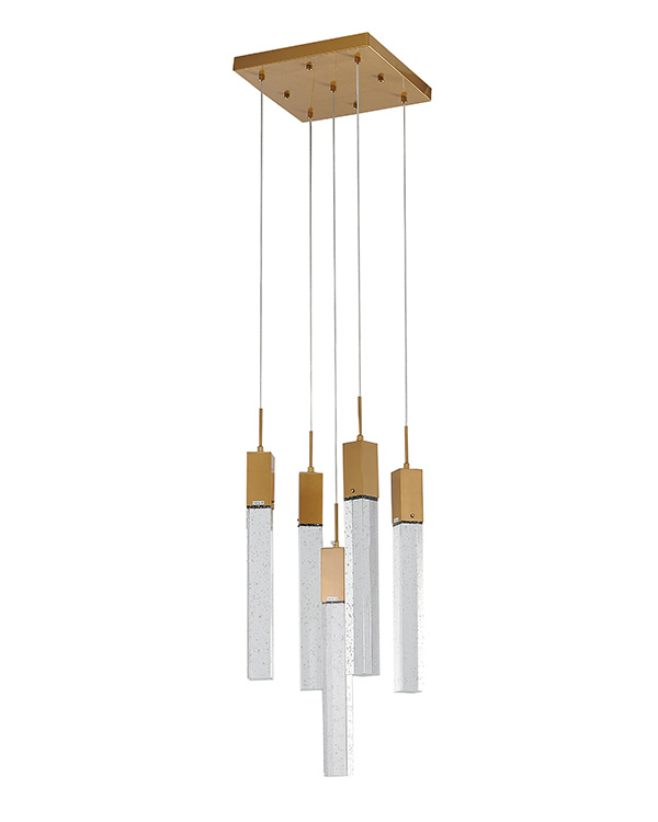 A FLUSHED GOLD FRAME CHANDELIER WITH HANGING CLEAR BUBBLE BLOCK CRYSTALS