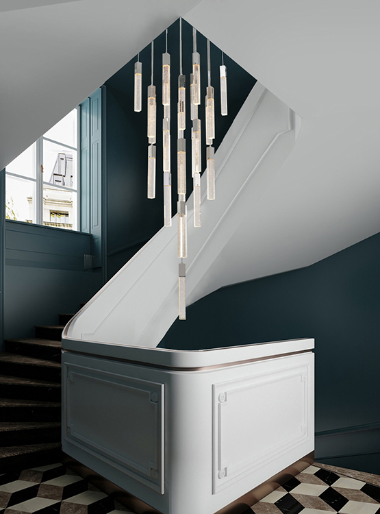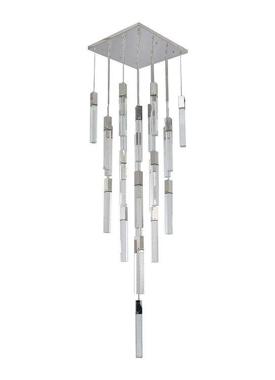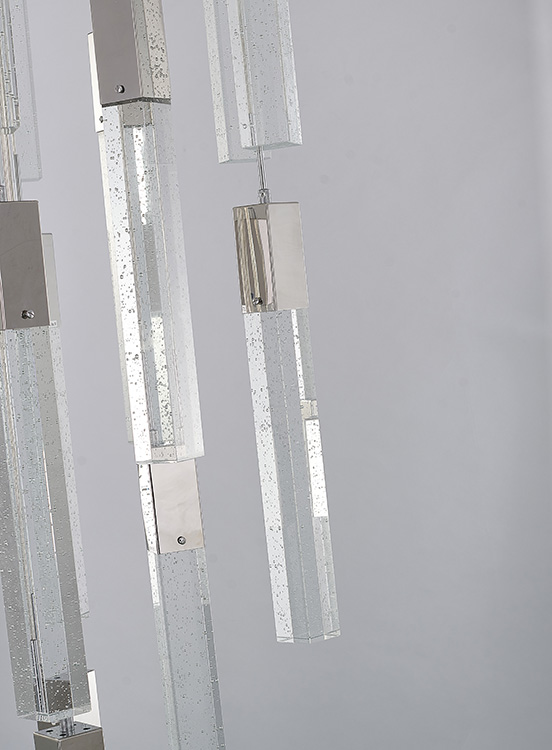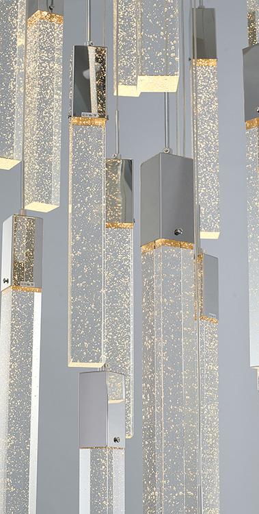 A FLUSHED MATTE BLACK FRAME CHANDELIER WITH HANGING CLEAR BUBBLE BLOCK CRYSTALS