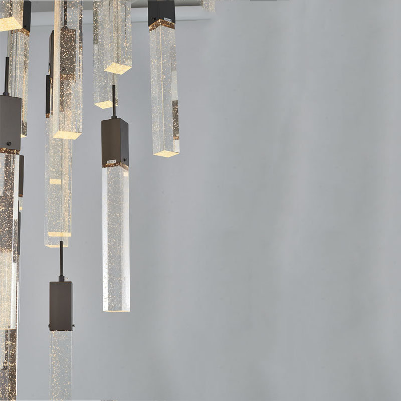 A FLUSHED BLACK GUN METAL FRAME CHANDELIER WITH HANGING CLEAR BLOCK BUBBLE CRYSTALS