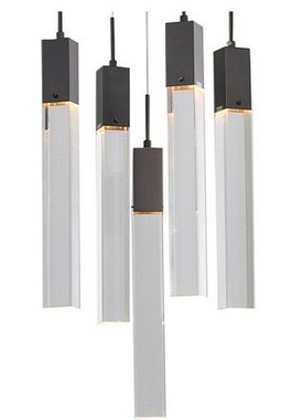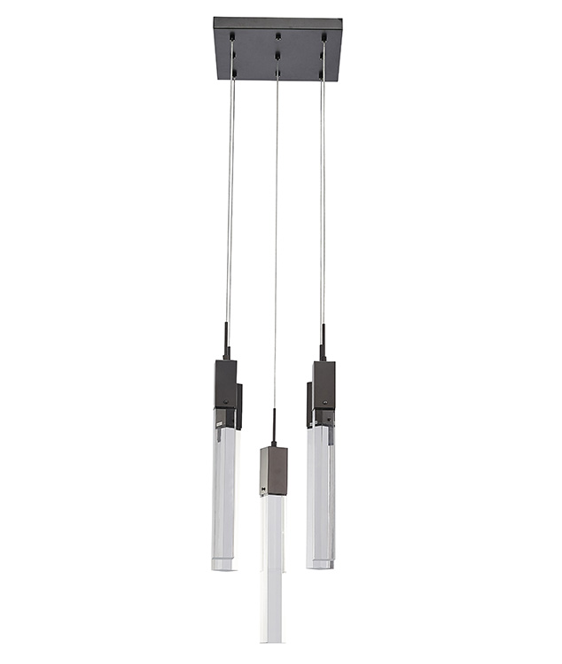 A FLUSHED BLACK GUN METAL FRAME CHANDELIER WITH HANGING CLEAR BLOCK CRYSTAL PENDANTS