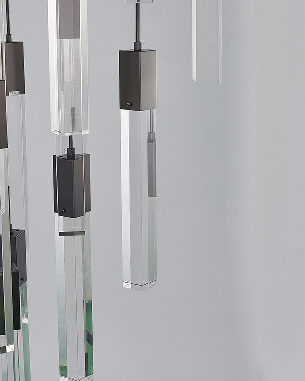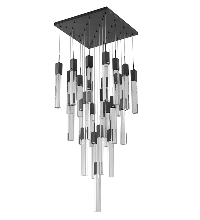 A FLUSHED BLACK GUN METAL FRAME CHANDELIER WITH HANGING CLEAR BLOCK PENDANT CRYSTALS