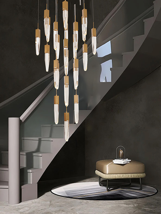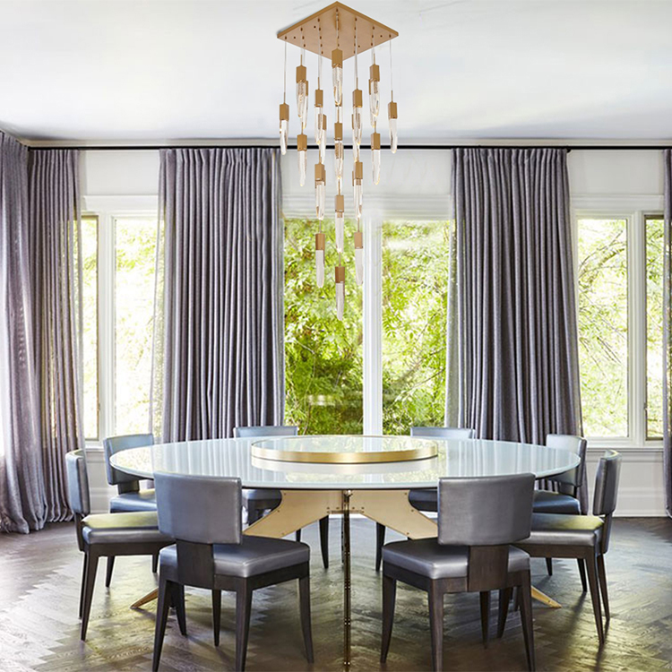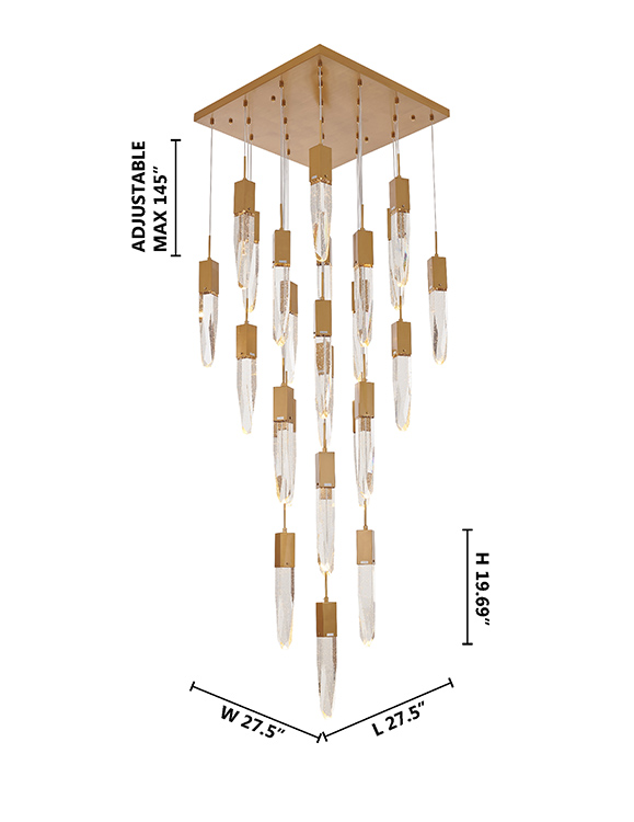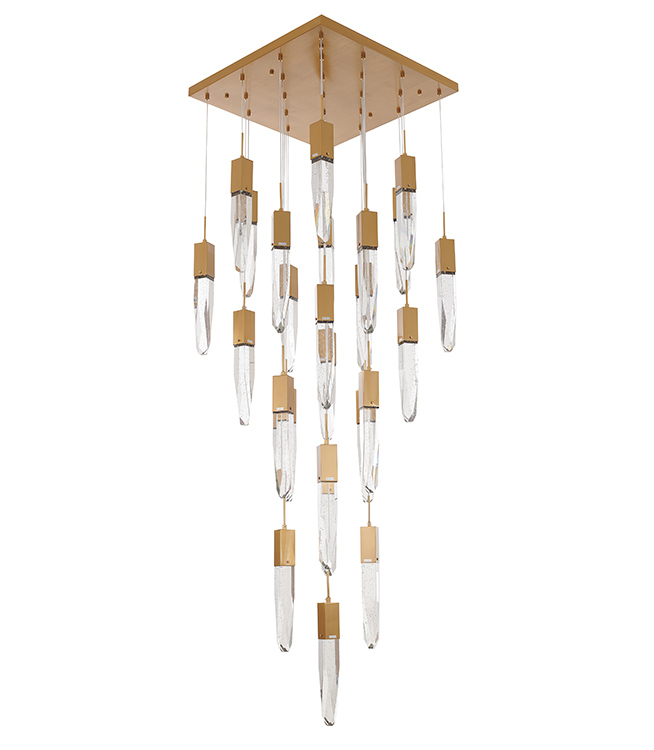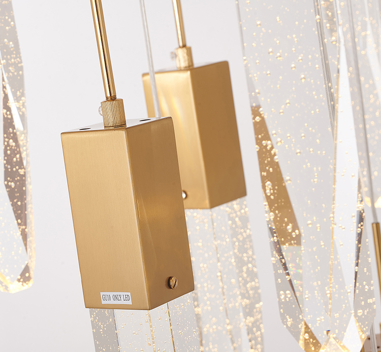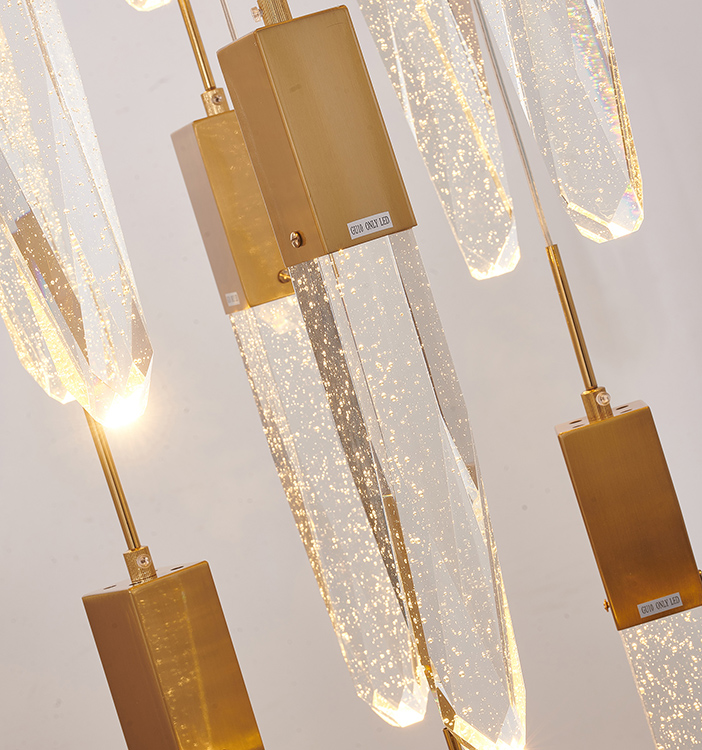 A GOLD FLUSHED FRAME CHANDELIER WITH HANGING CLEAR ICEBERG BUBBLE CRYSTALS