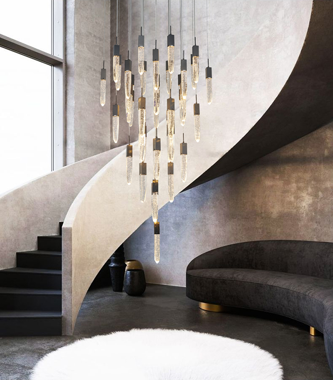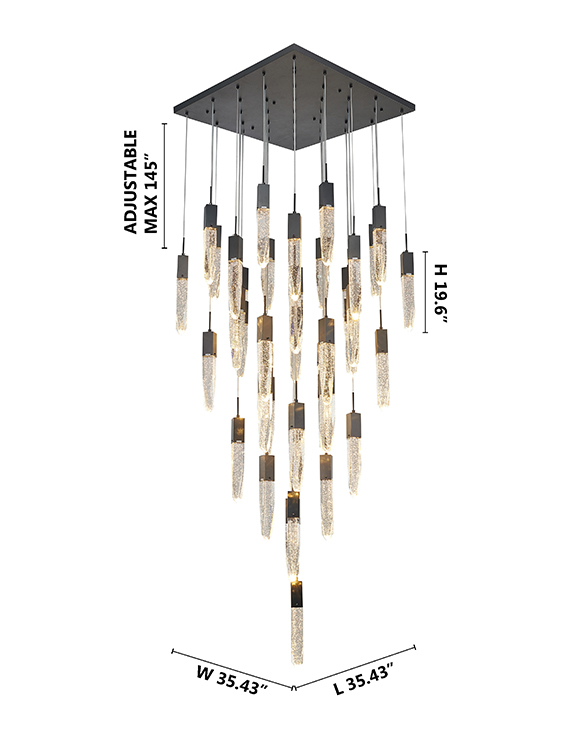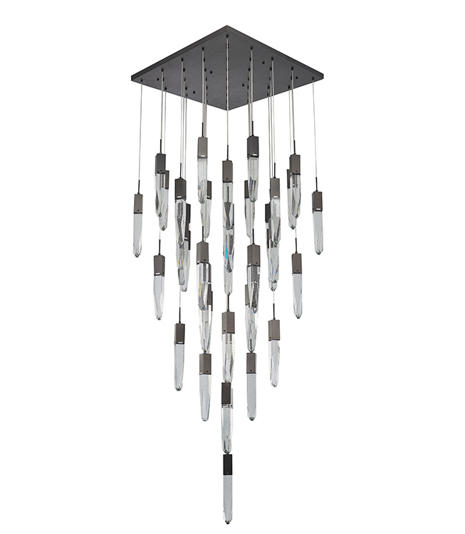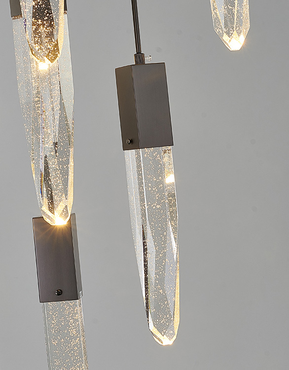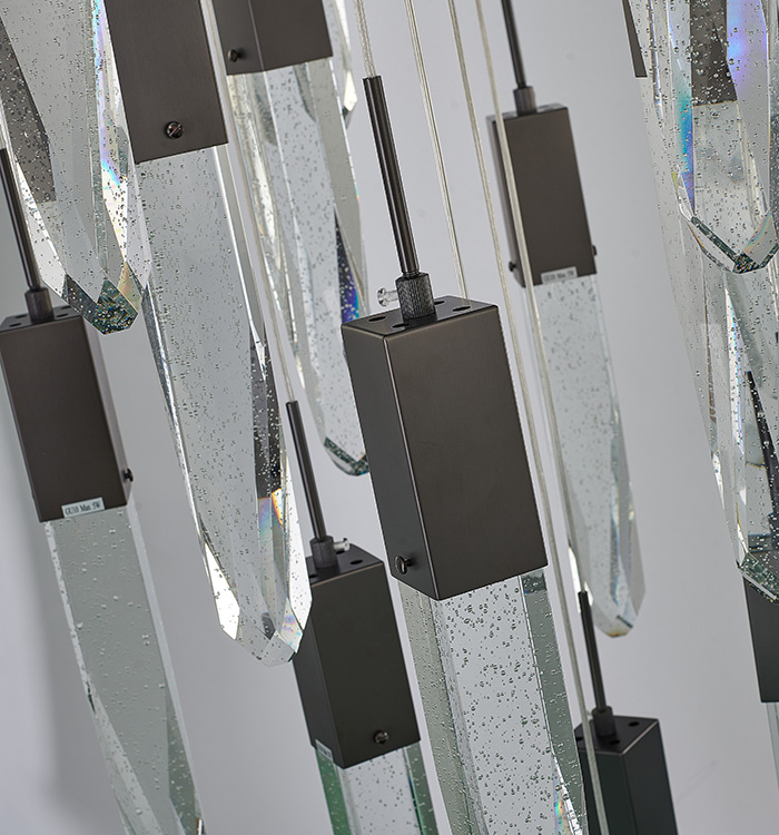 A FLUSHED BLACK GUN METAL FRAME CHANDELIER WITH CLEAR BUBBLE HANGING CRYSTAL PENDANTS