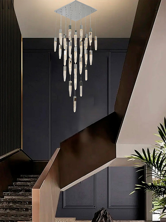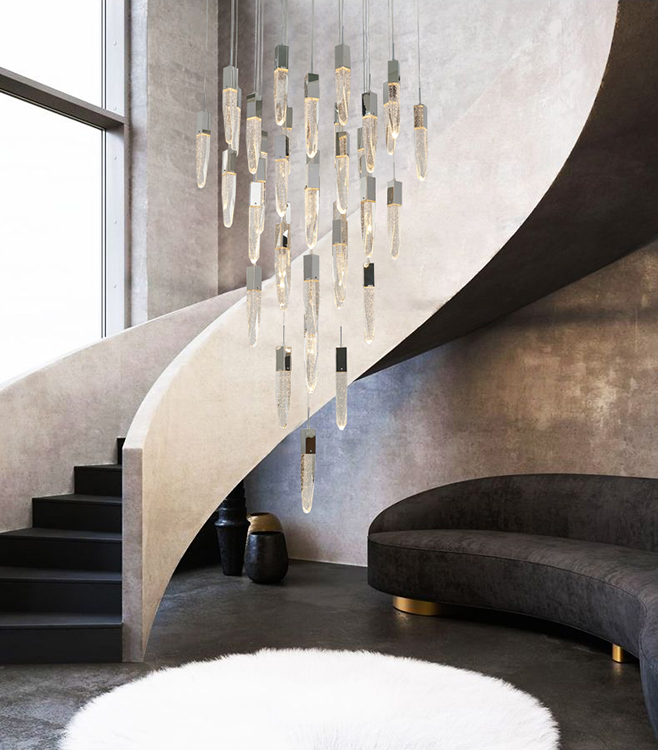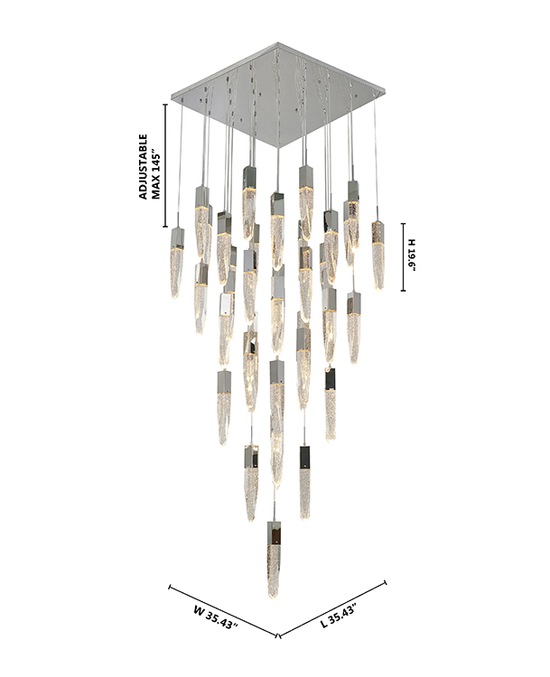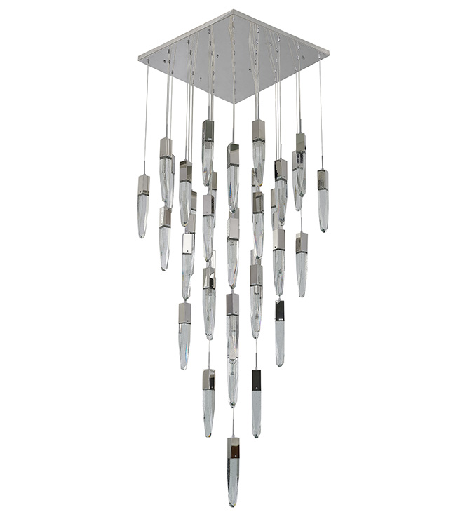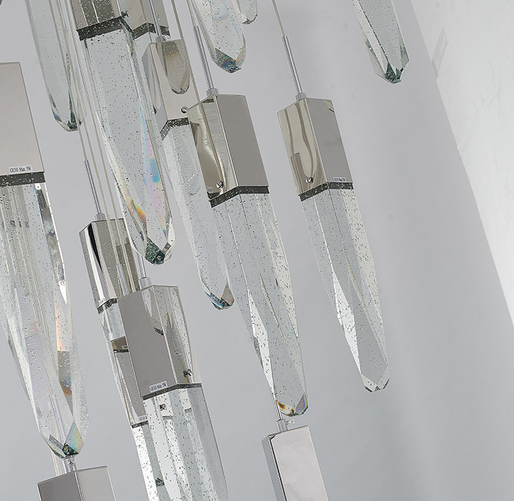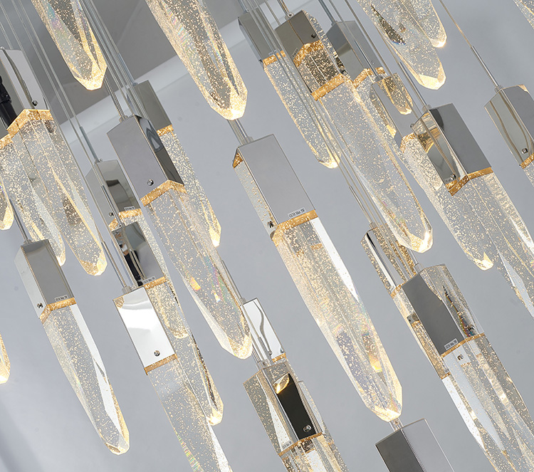 A FLUSHED CHROME FRAME CHANDELIER WITH CLEAR BUBBLE HANGING CRYSTAL PENDANTS