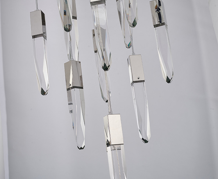A CHROME FLUSHED FRAME CHANDELIER WITH CLEAR ICEBERG HANGING PENDANTS