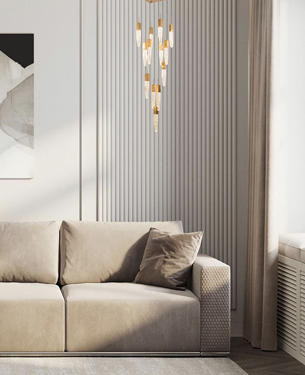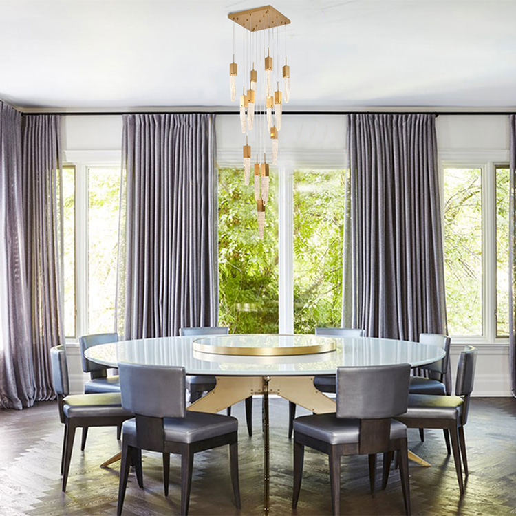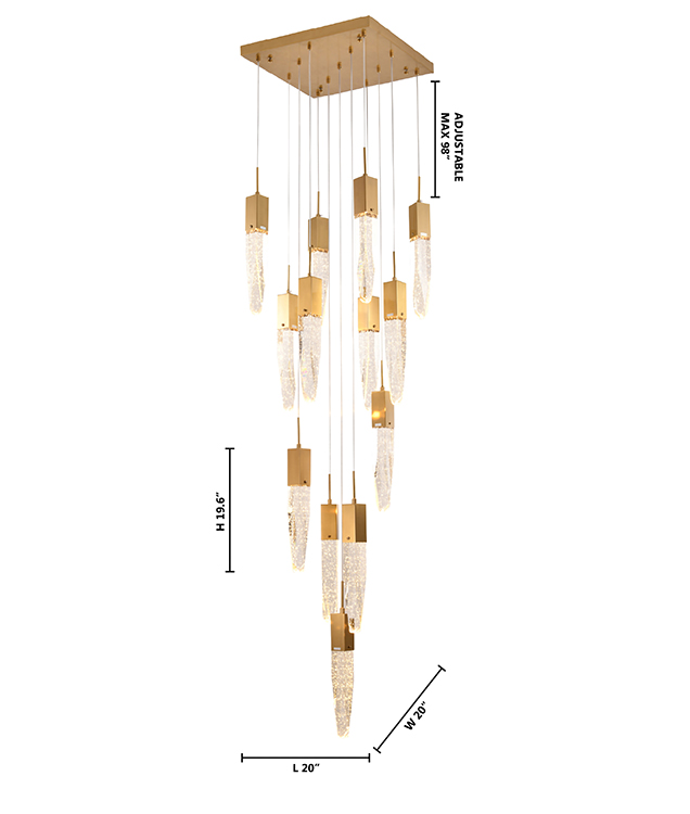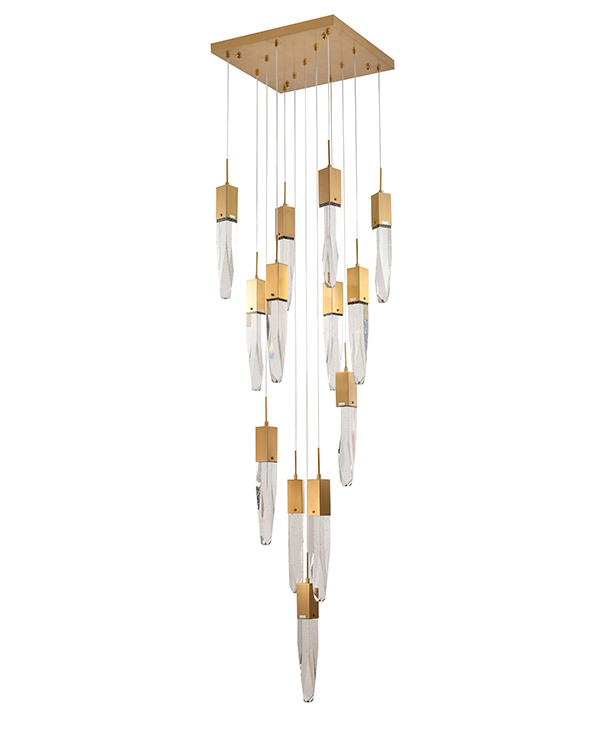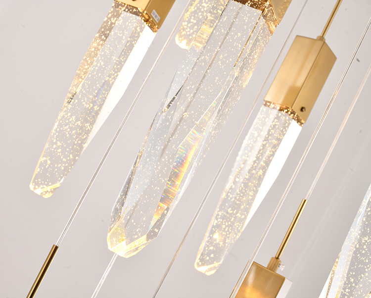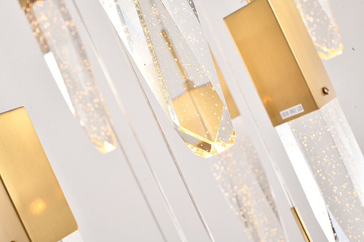 A GOLD HAIRLINED METAL FRAME CHANDELIER WITH CLEAR BUBBLE CRYSTAL PENDANTS