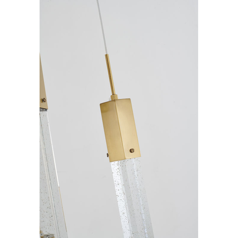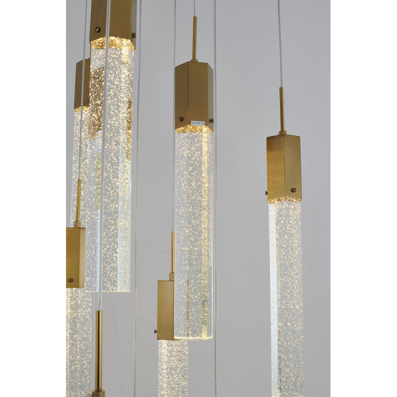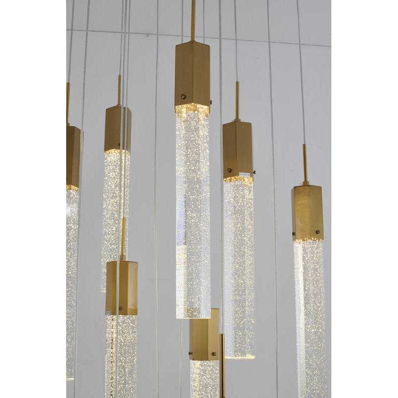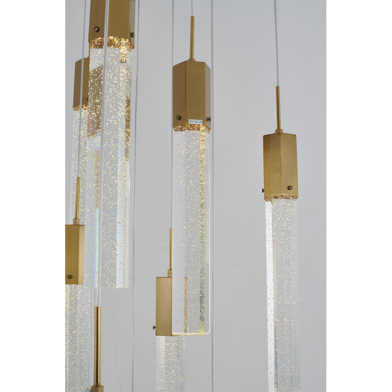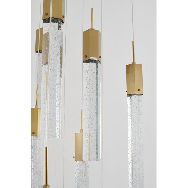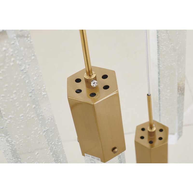 A GOLD FLUSHED FRAME CHANDELIER WITH CLEAR HEXAGON BUBBLE CRYSTAL HANGING PENDANTS