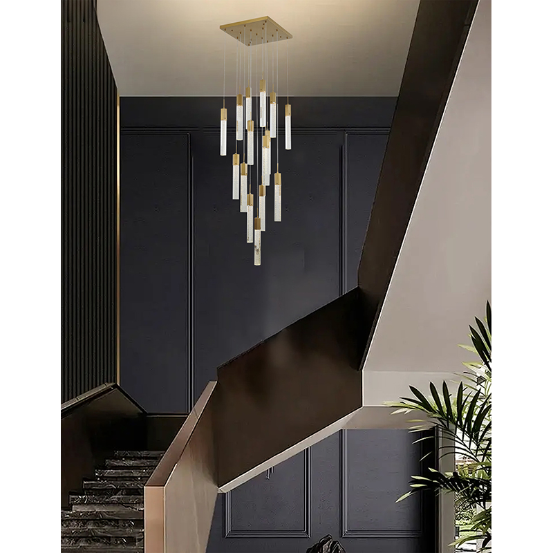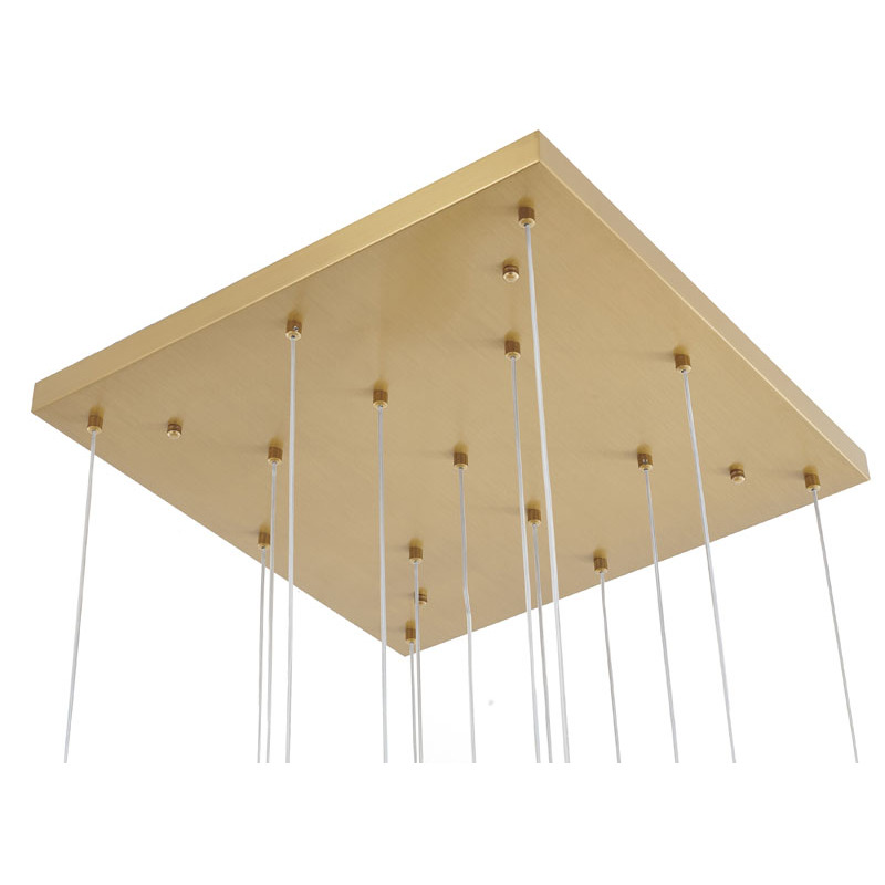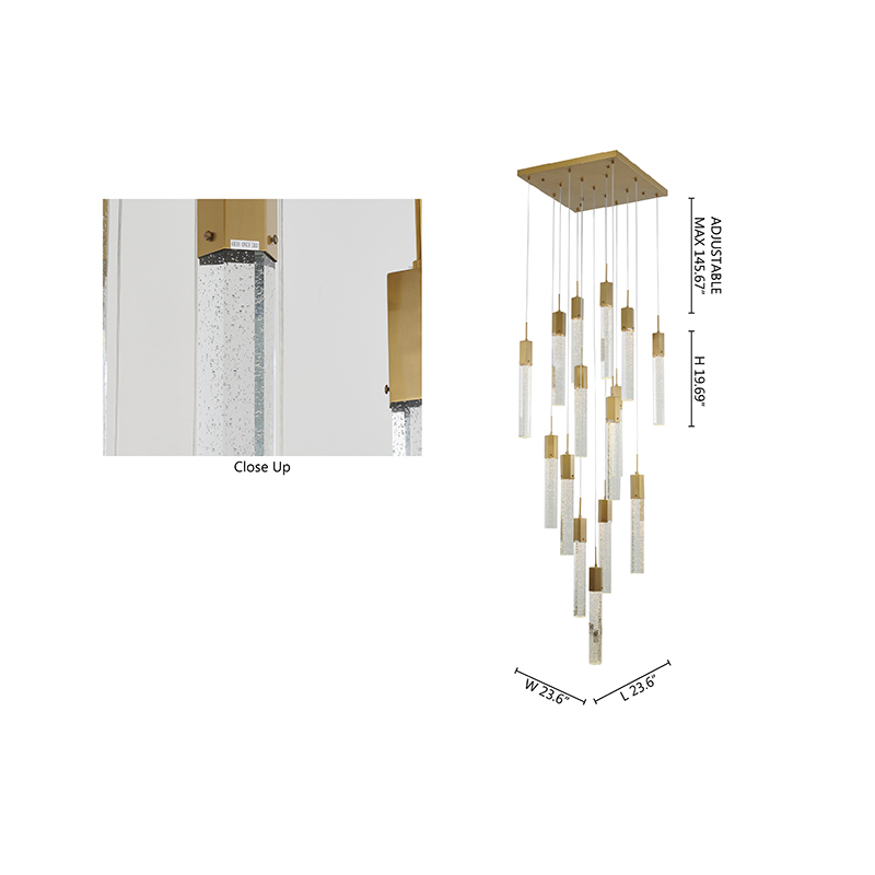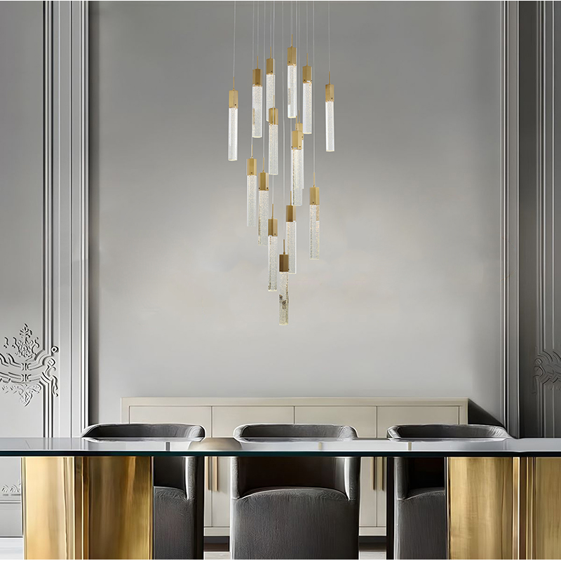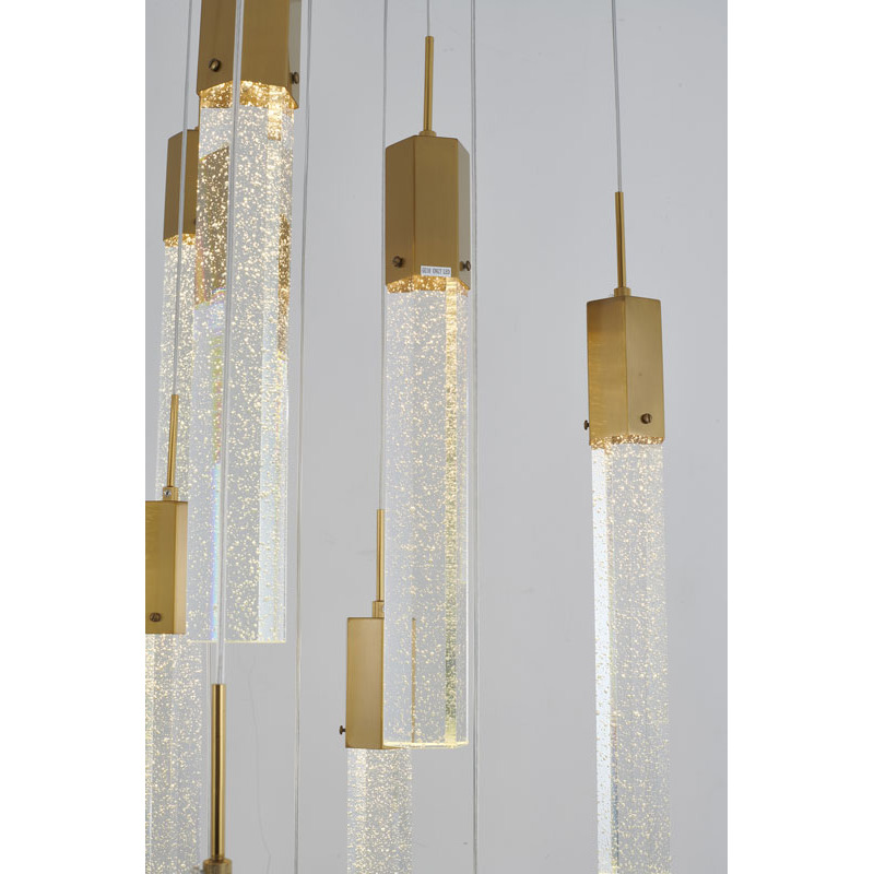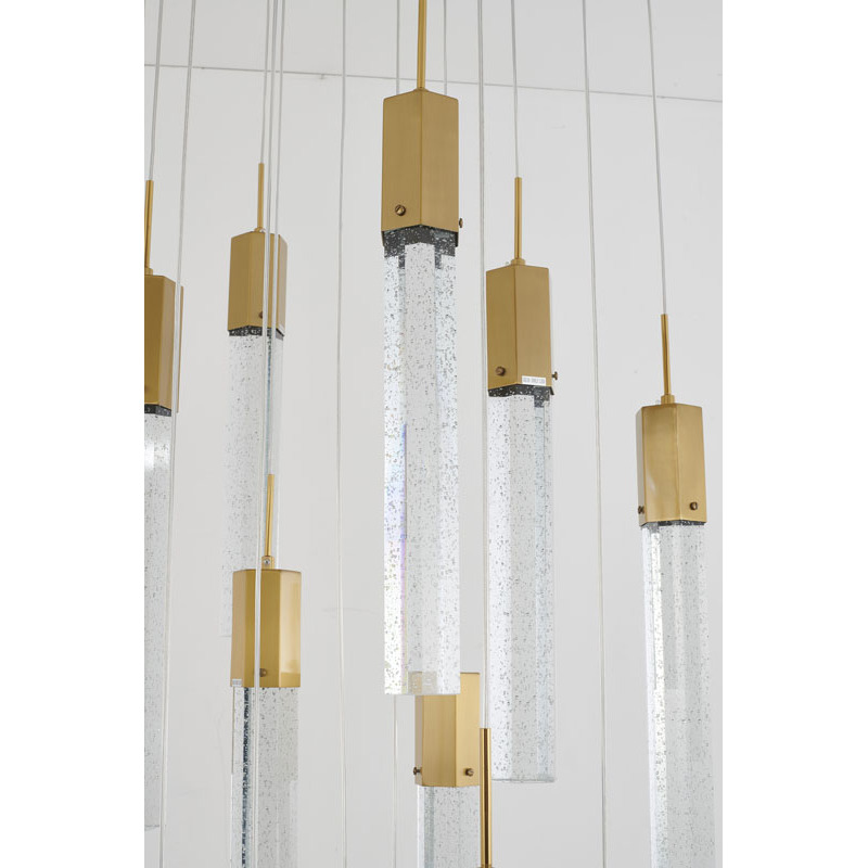 A GOLD FLUSHED FRAME CHANDELIER WITH CLEAR HEXAGON BUBBLE CRYSTAL HANGING PENDANTS