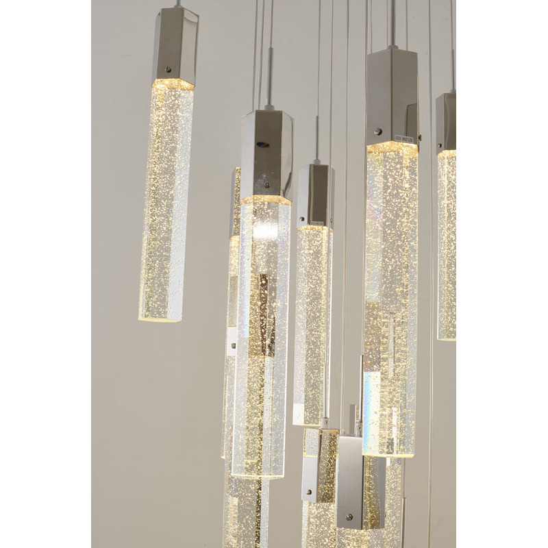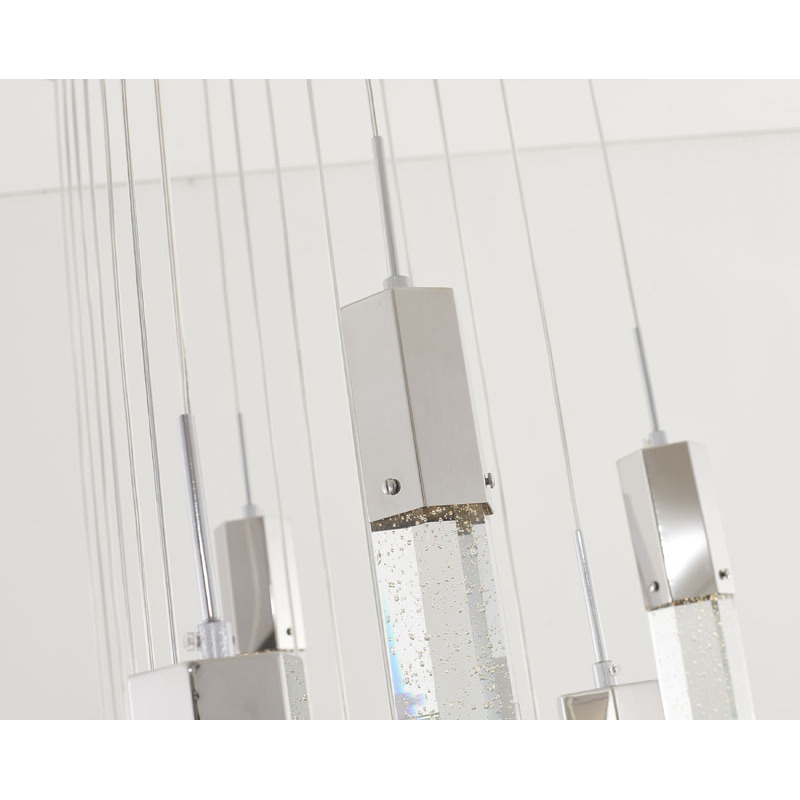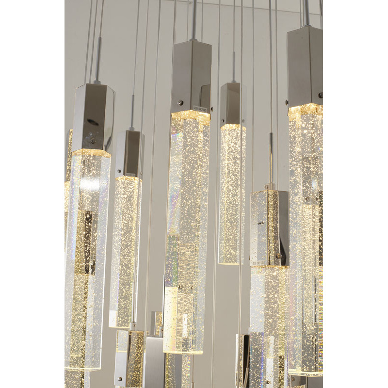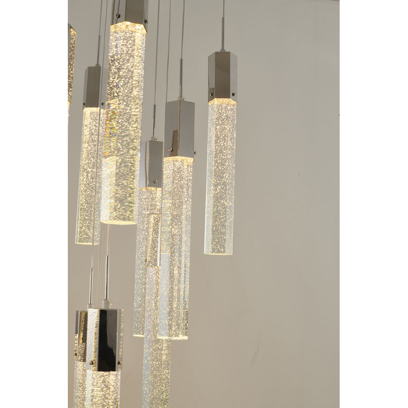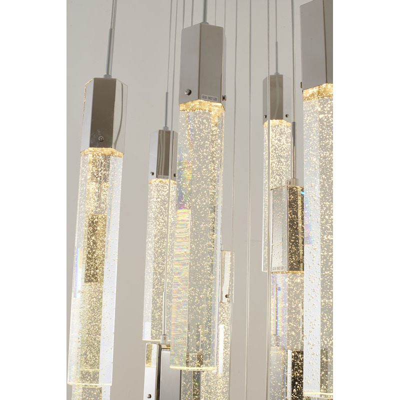 A CHROME FLUSHED FRAME CHANDELIER WITH CLEAR HEXAGON BUBBLE CRYSTAL HANGING PENDANTS