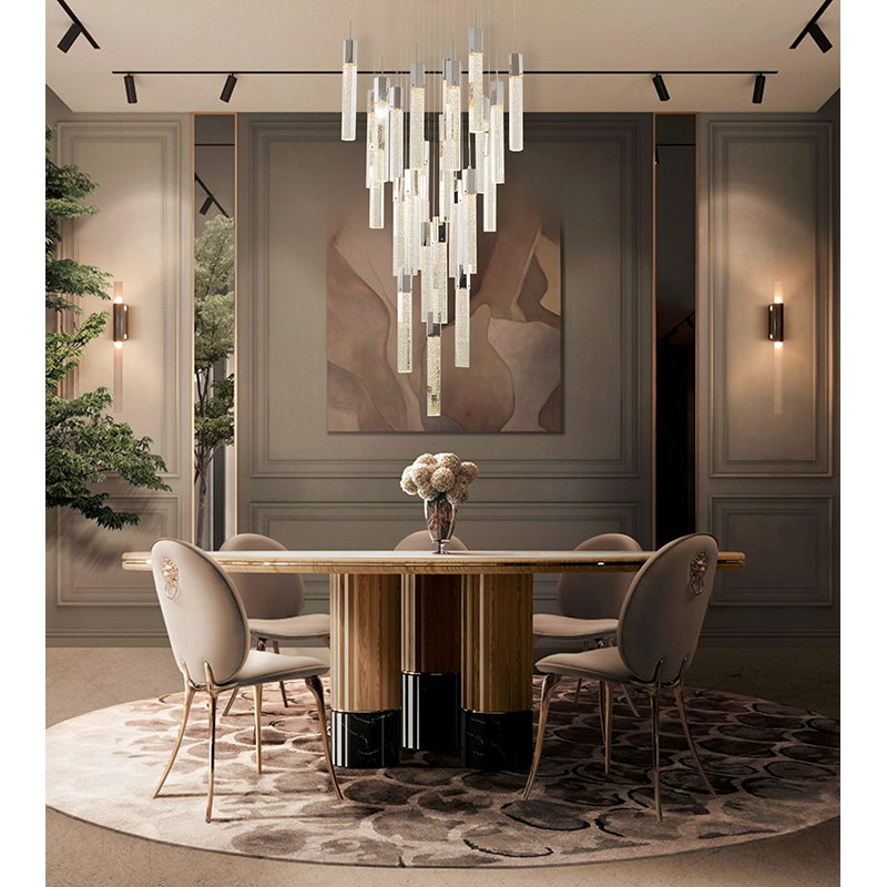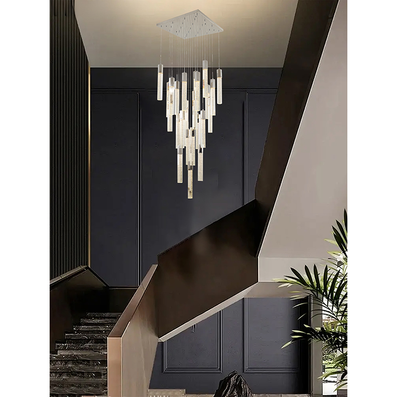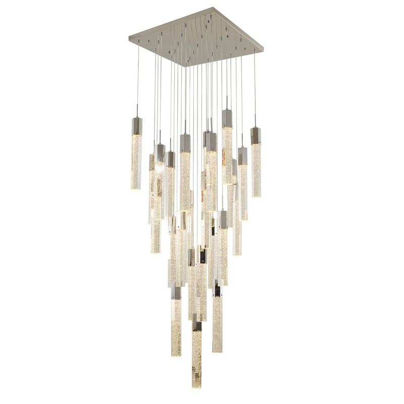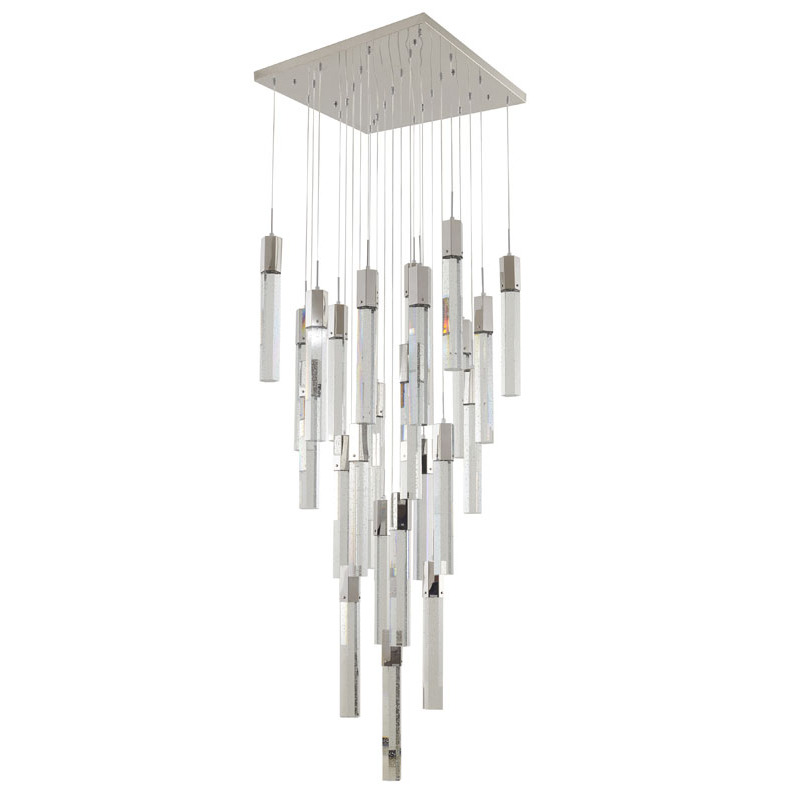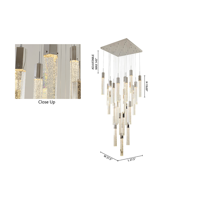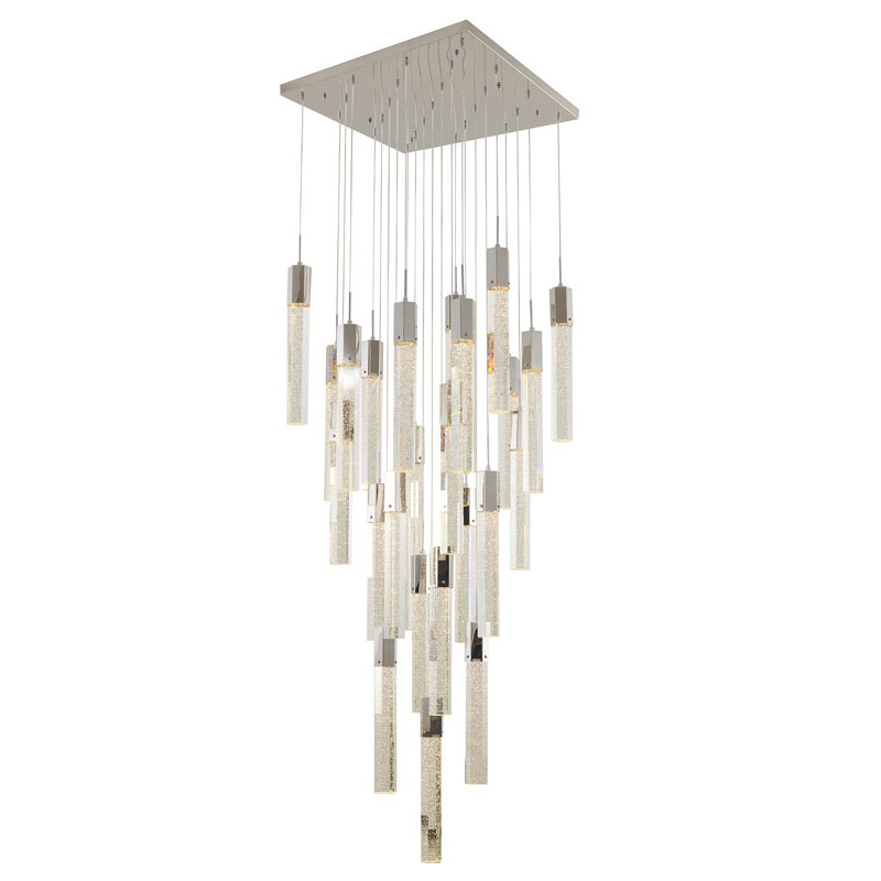 A CHROME FLUSHED FRAME CHANDELIER WITH CLEAR HEXAGON BUBBLE CRYSTAL HANGING PENDANTS
