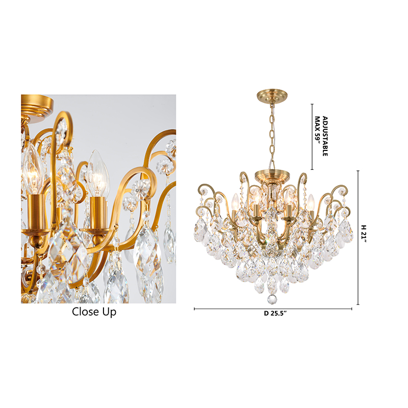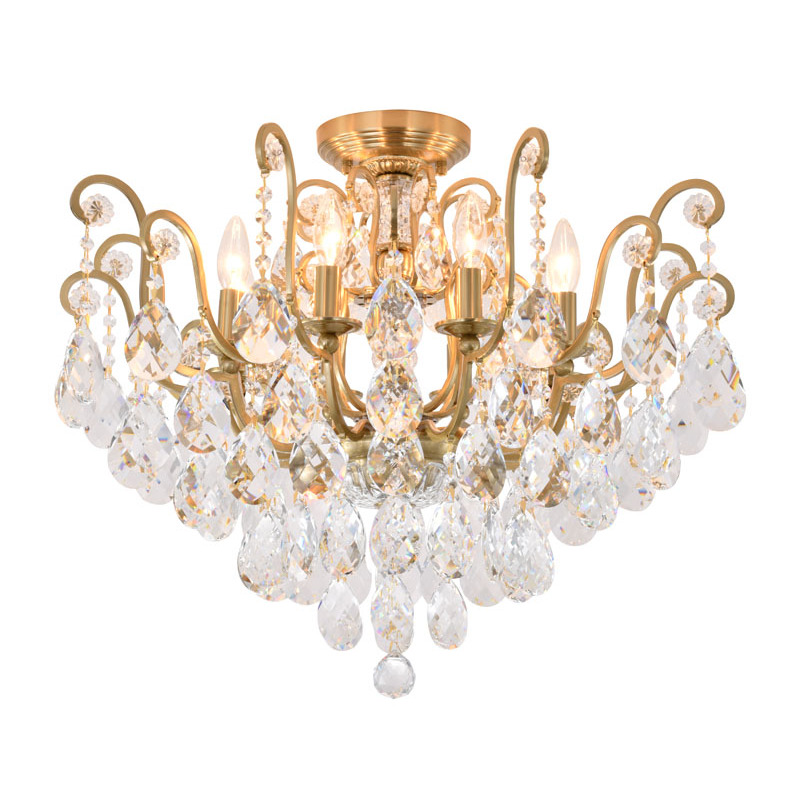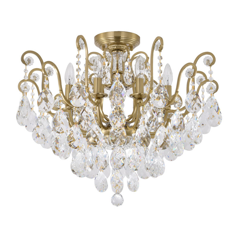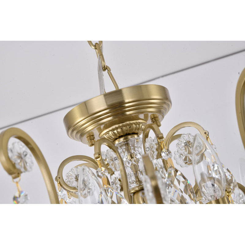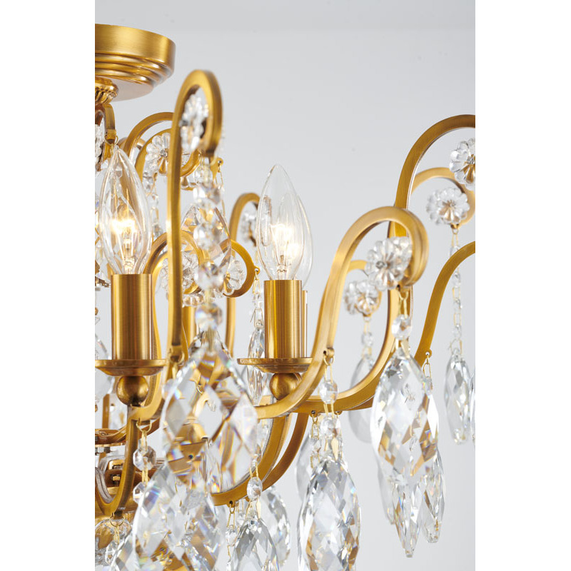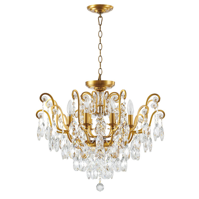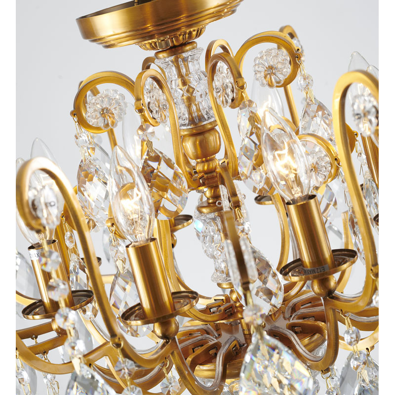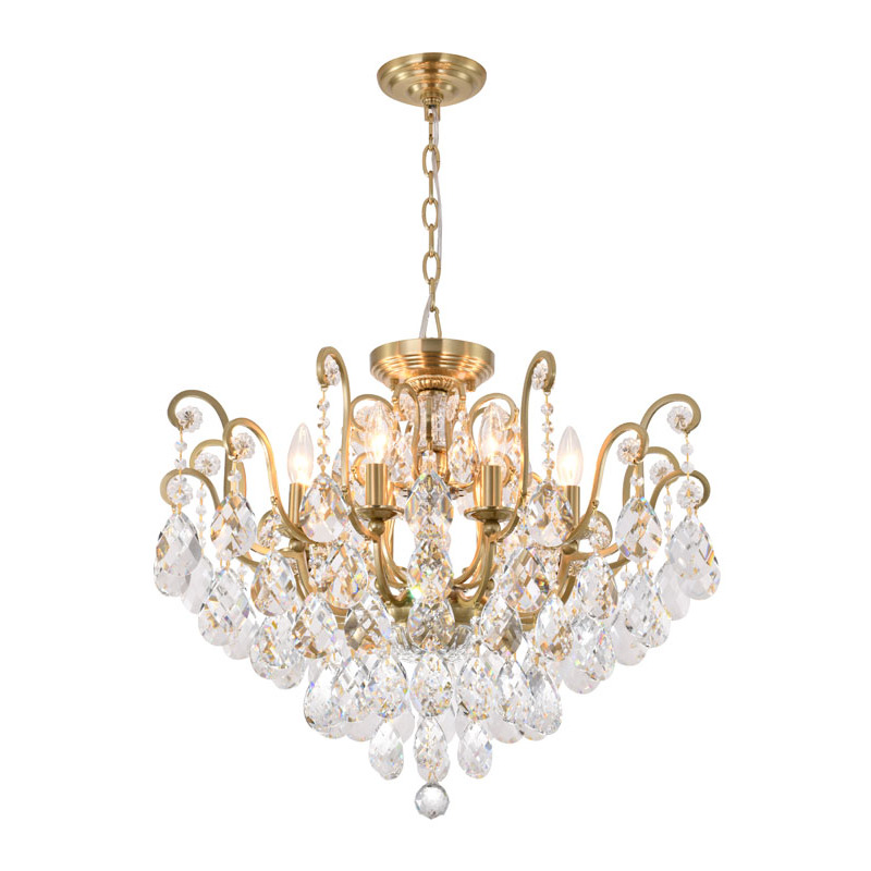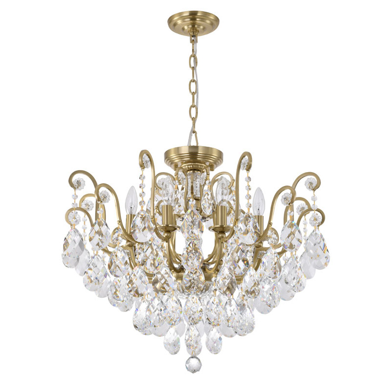 AN ANTIQUE BRASS FRAME CHANDELIER WITH CLEAR HANGING CRYSTALS