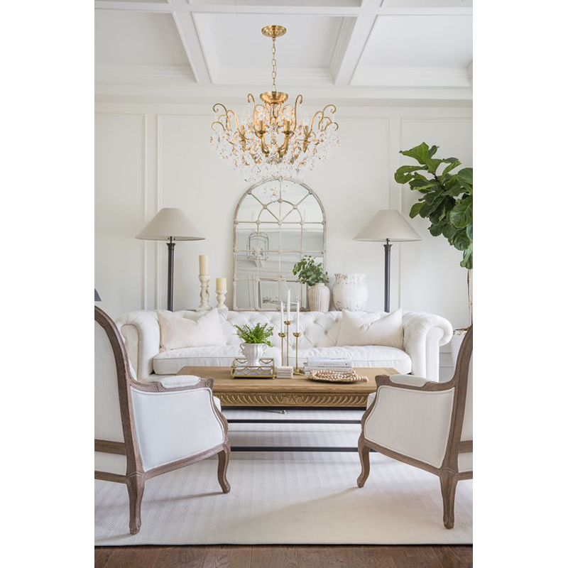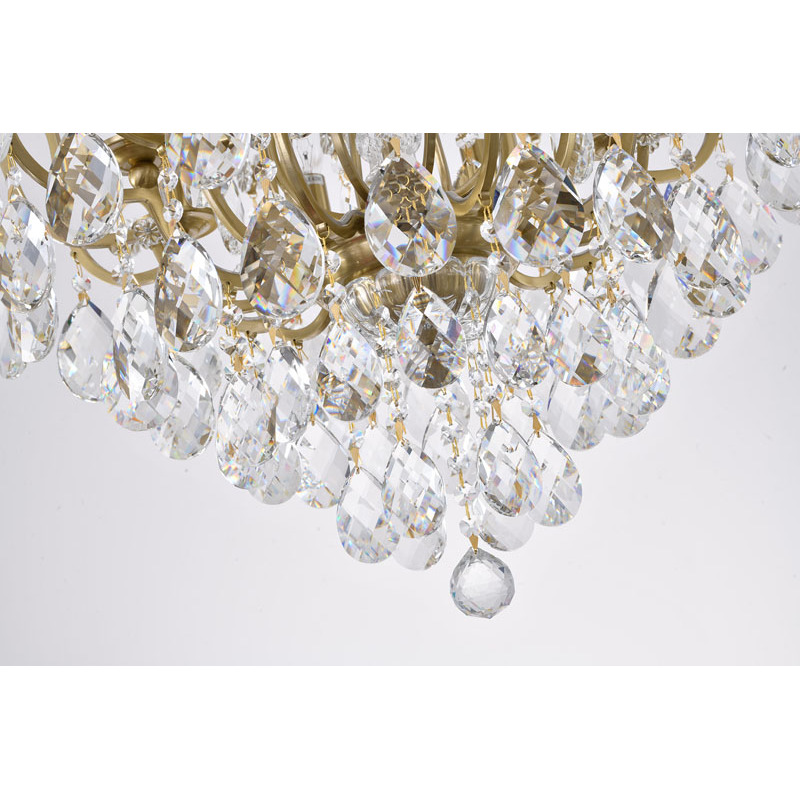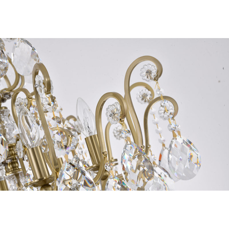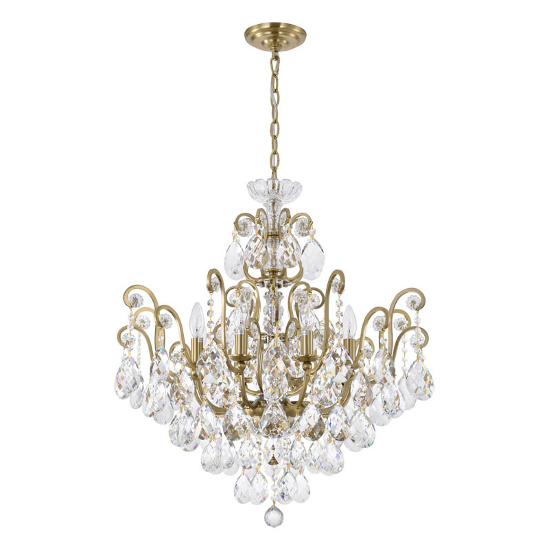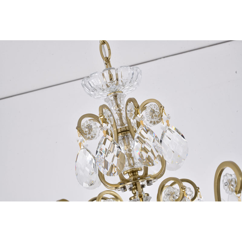 AN ANTIQUE BRASS CHANDELIER WITH CLEAR HANGING CRYSTALS & GLASS ACCENTS