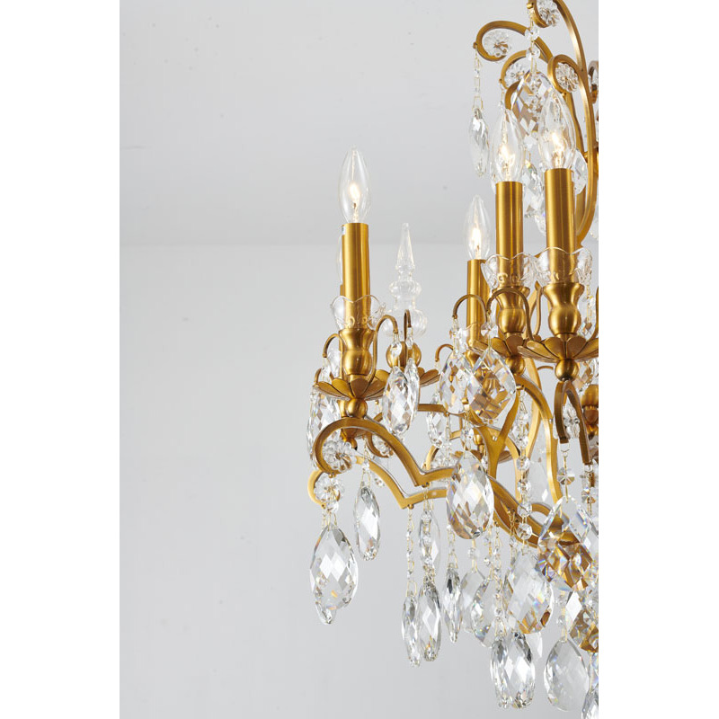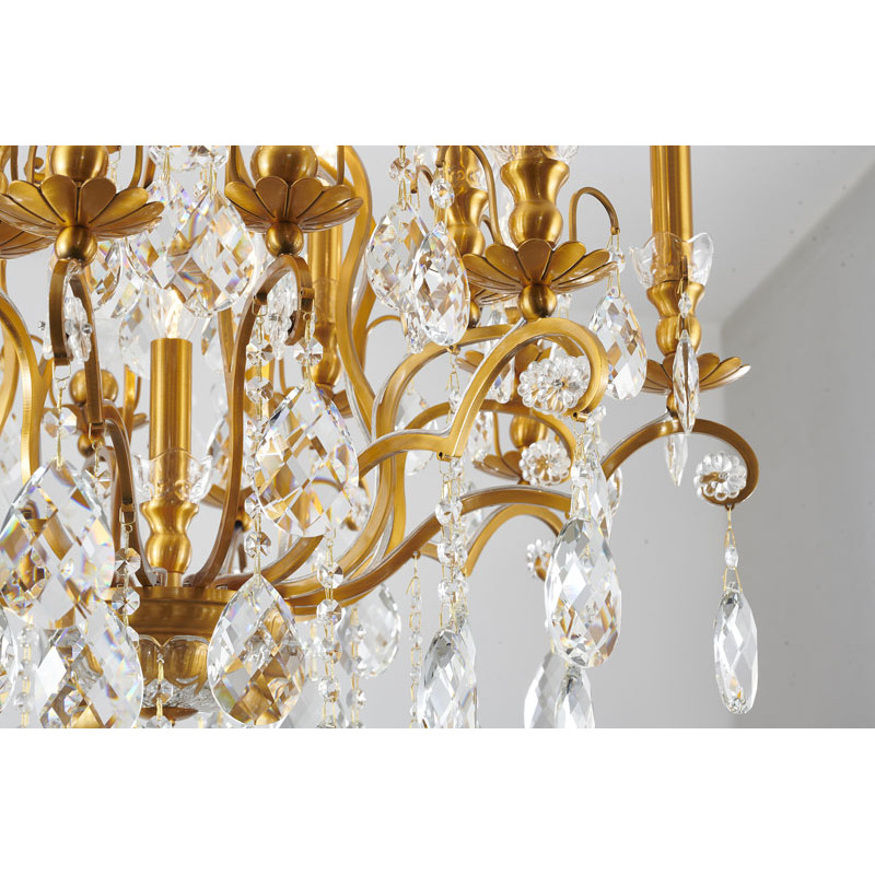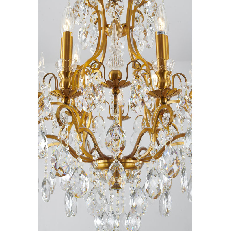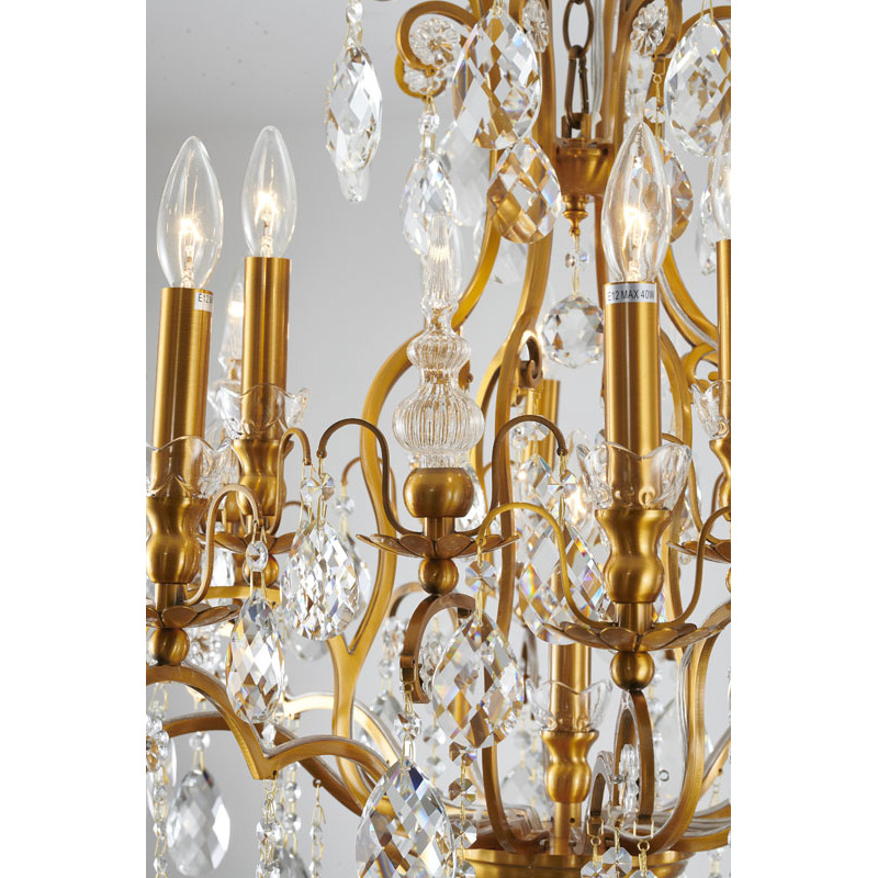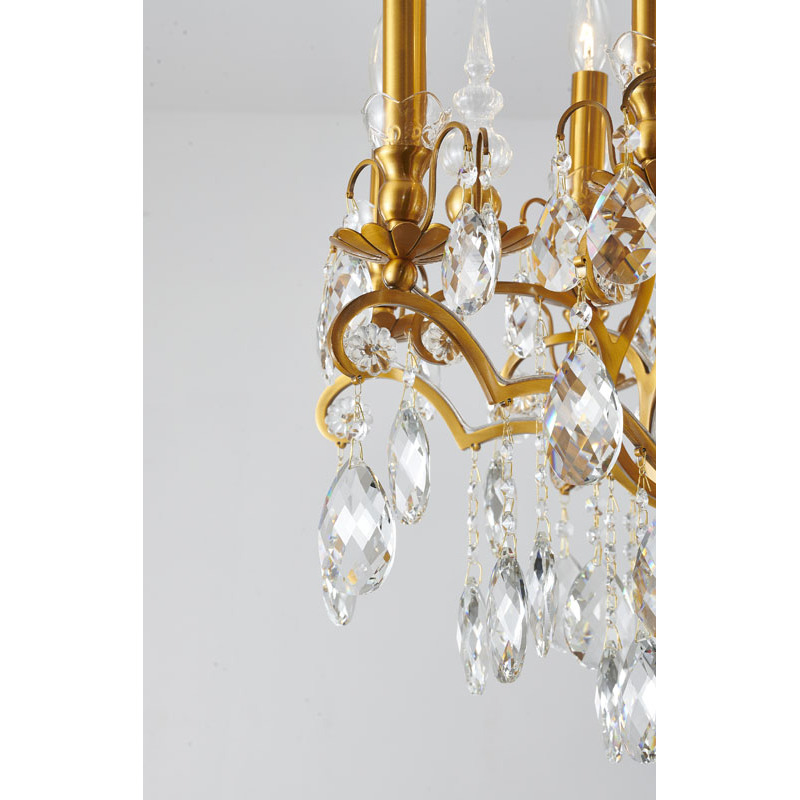 AN ANTIQUE BRASS CHANDELIER WITH CLEAR HANGING CRYSTALS AND GLASS ACCENTS