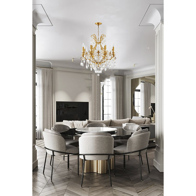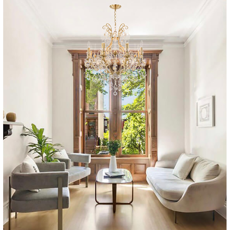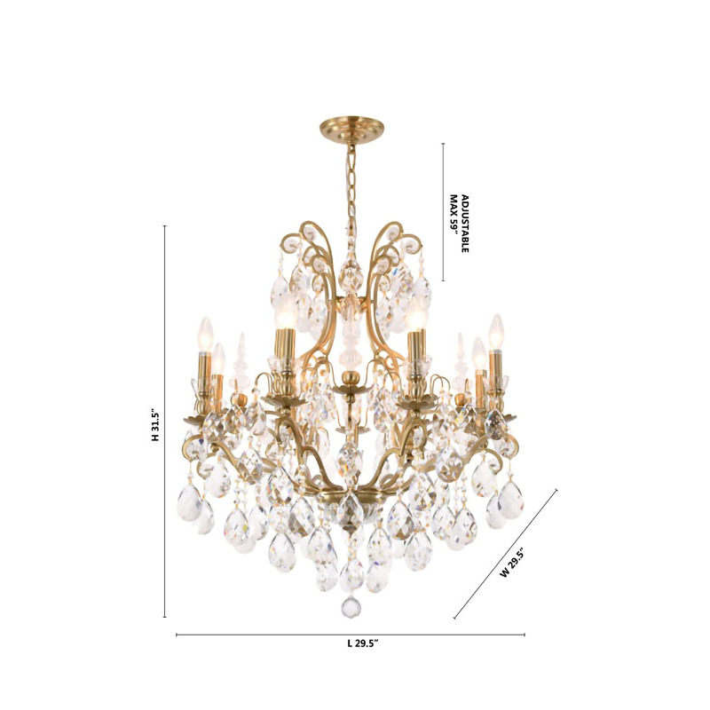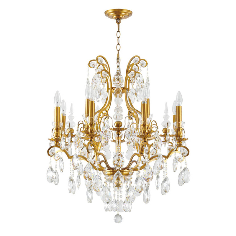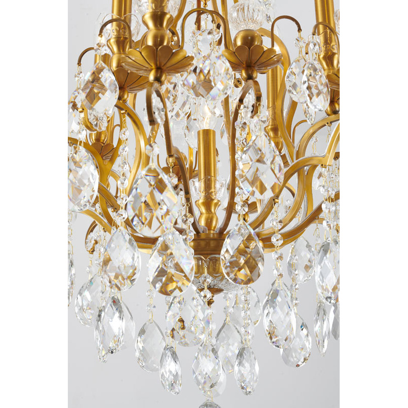 AN ANTIQUE BRASS CHANDELIER WITH CLEAR HANGING CRYSTALS AND GLASS ACCENTS