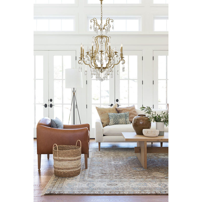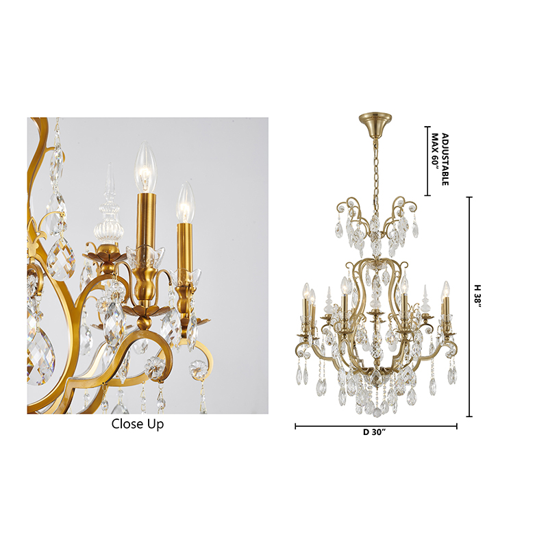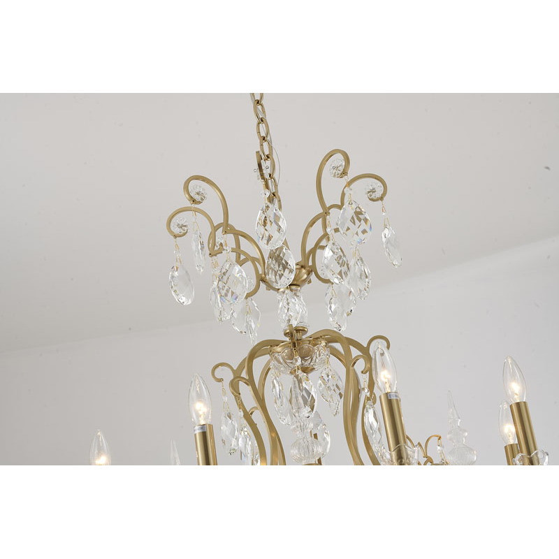 A BRASS FRAME CHANDELIER WITH CLEAR HANGING CRYSTALS