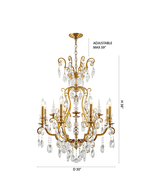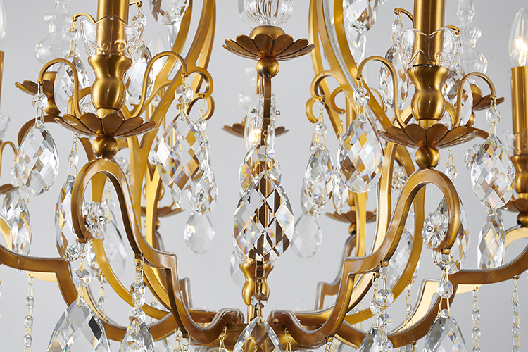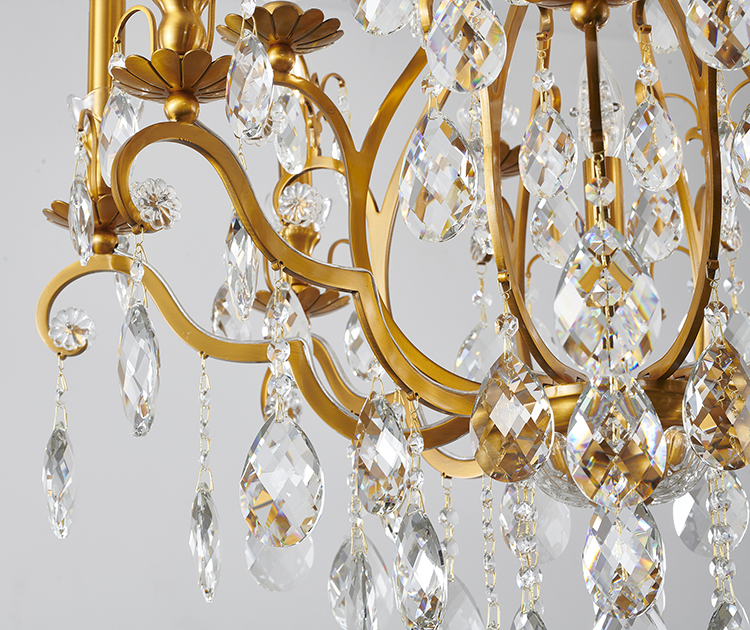 AN ANTIQUE BRASS FRAME CHANDELIER WITH CLEAR HANGING CRYSTALS
