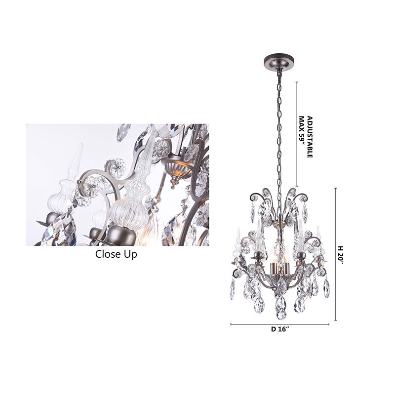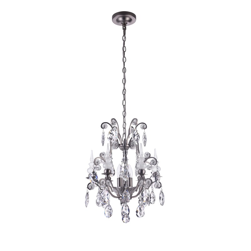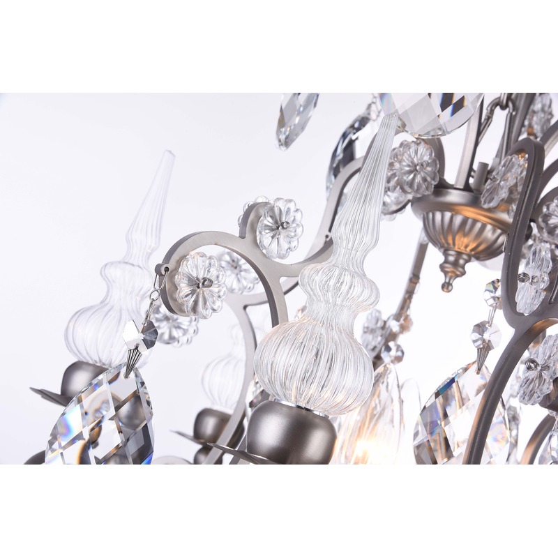 A CLEAR CRYSTAL CHANDELIER WITH A PEWTER COLOR FRAME