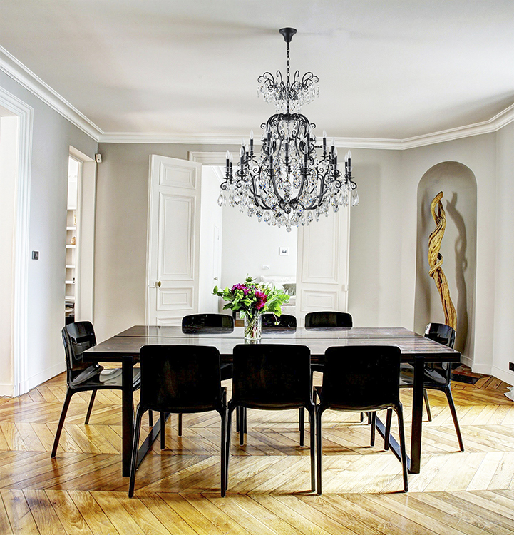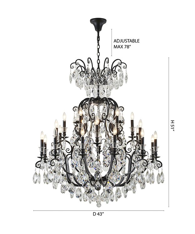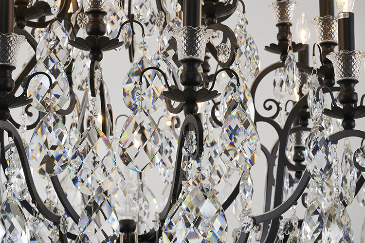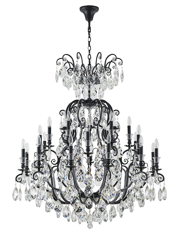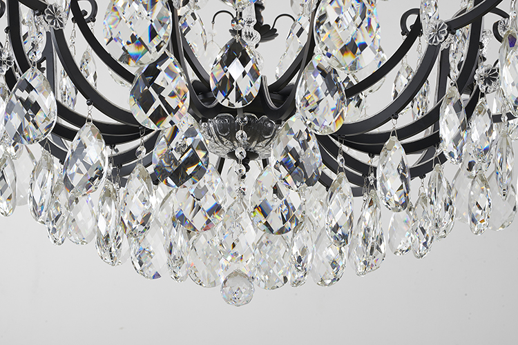A THREE TIER MATTE BLACK CHANDELIER WITH CLEAR HANGING CRYSTALS
