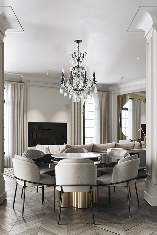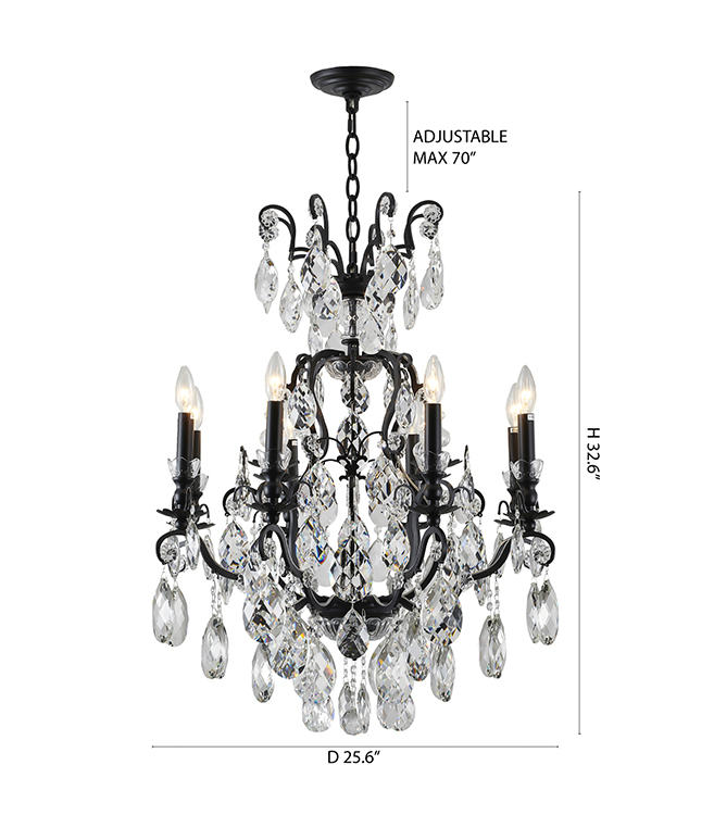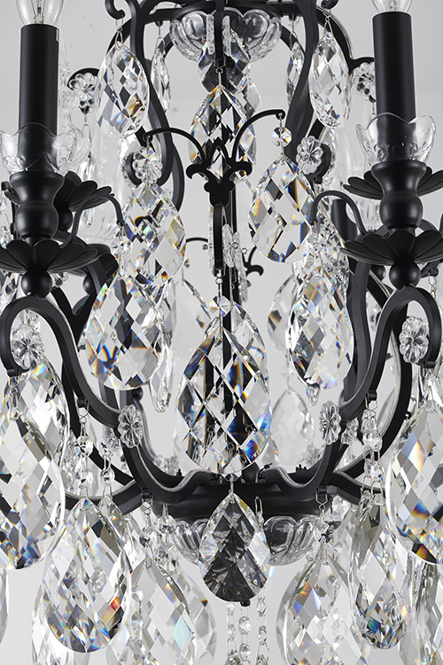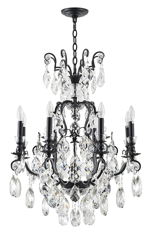A MATTE BLACK FRAME CHANDELIER WITH CLEAR HANGING CRYSTALS