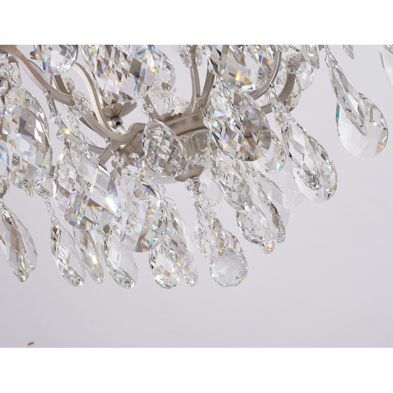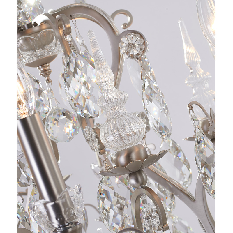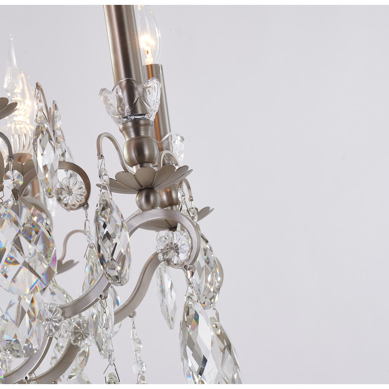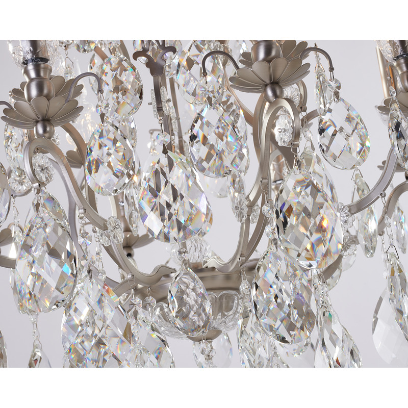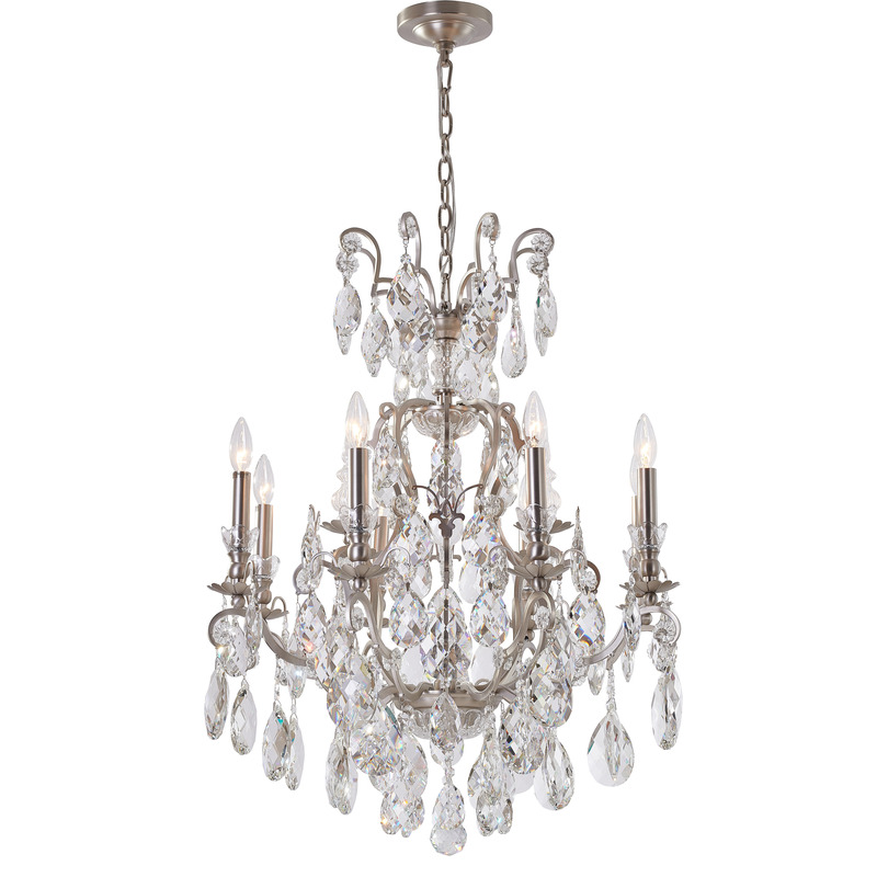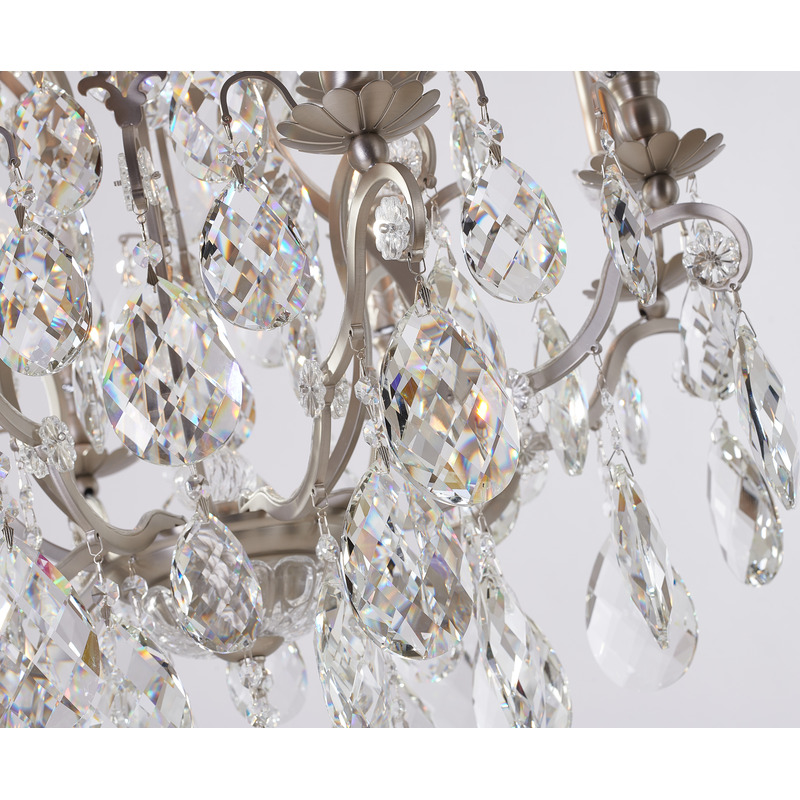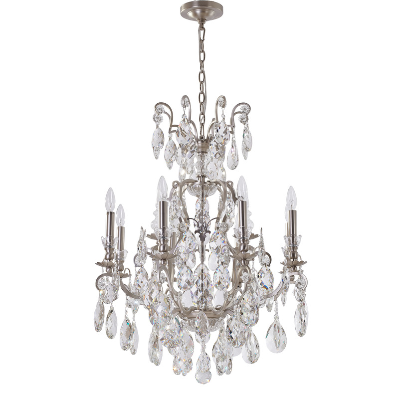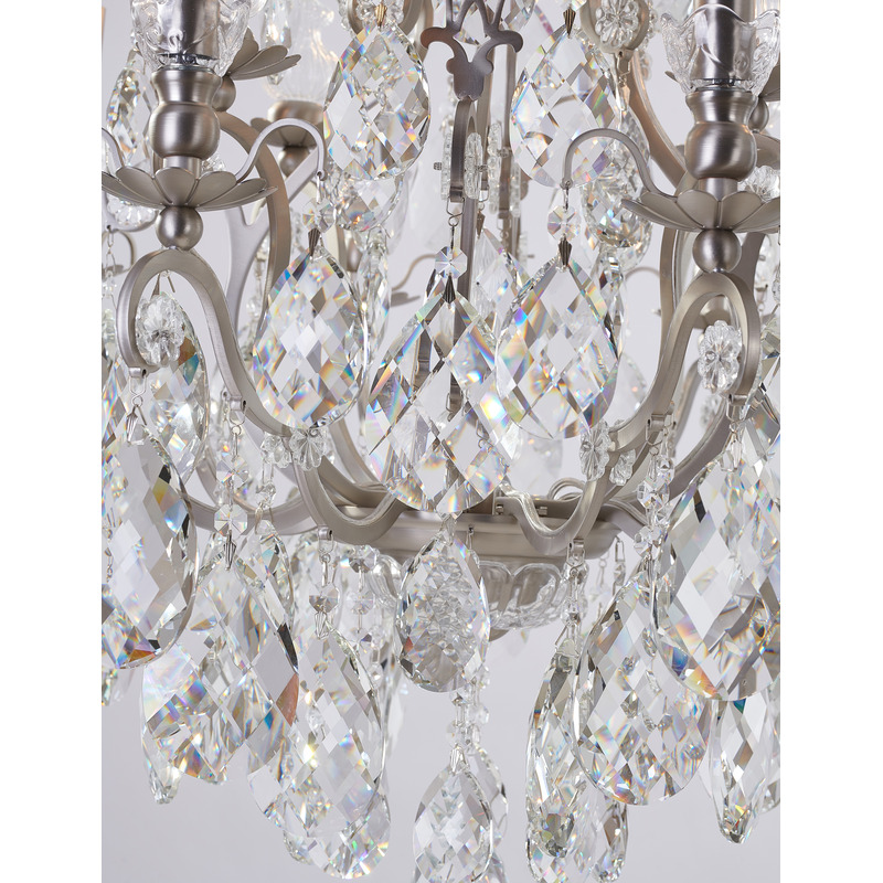 A PEWTER IRON FRAME CHANDELIER WITH CLEAR HANGING CRYSTALS