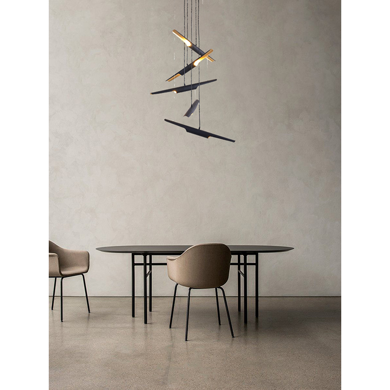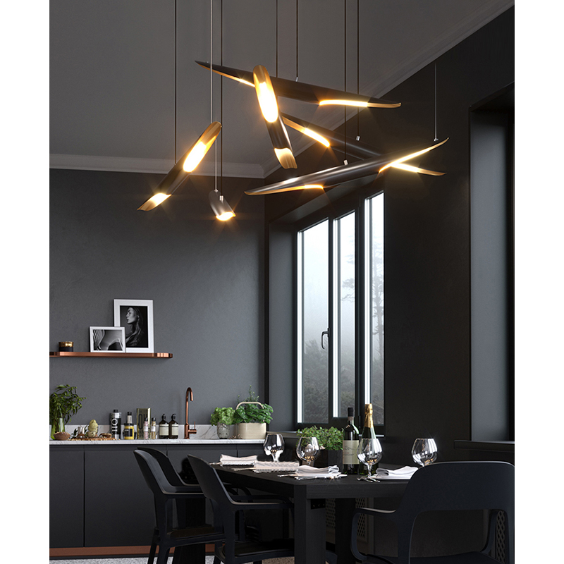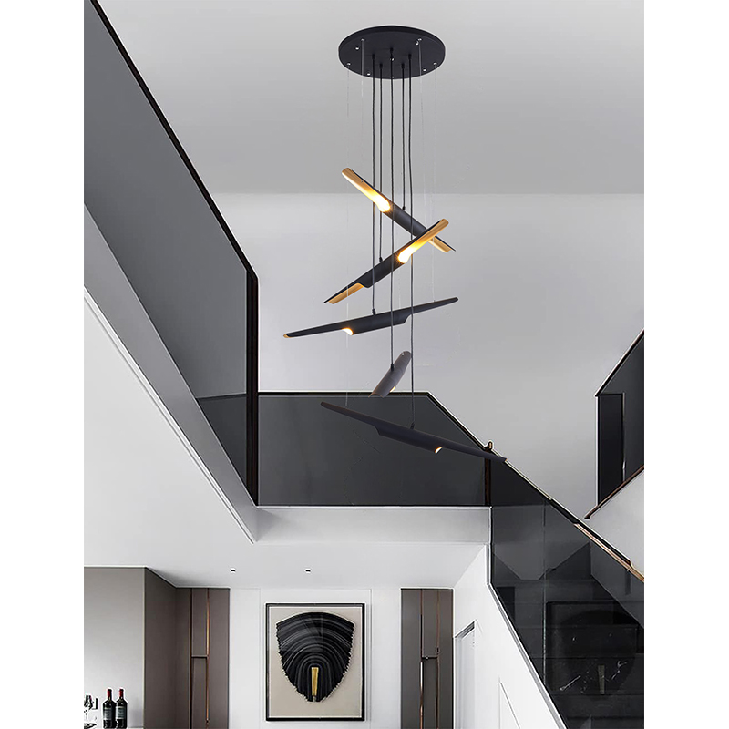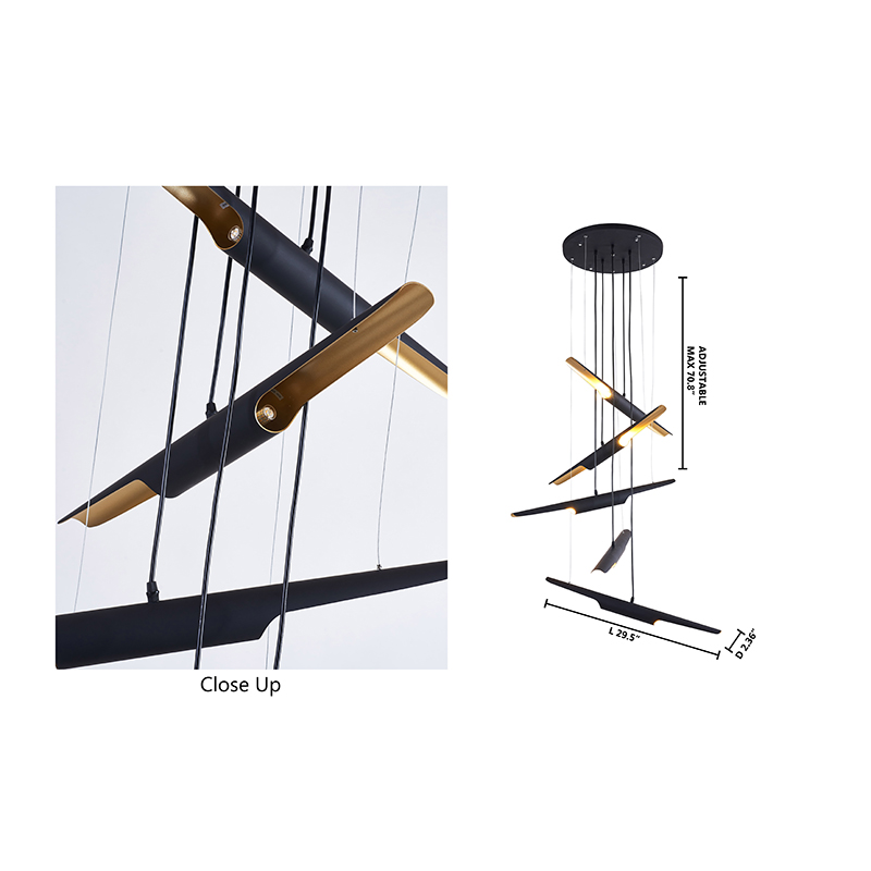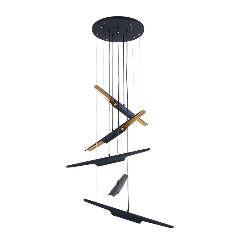 A MATTE BLACK FLUSHED CHANDELIER WITH HANGING PENDANT TUBES WITH GOLD INTERIOR
