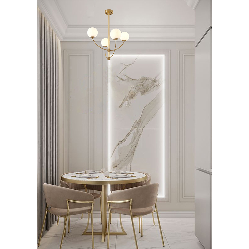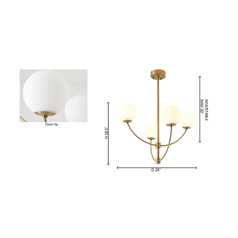 A BRASS ARMED FRAME CHANDELIER WITH WHITE GLASS SHADES