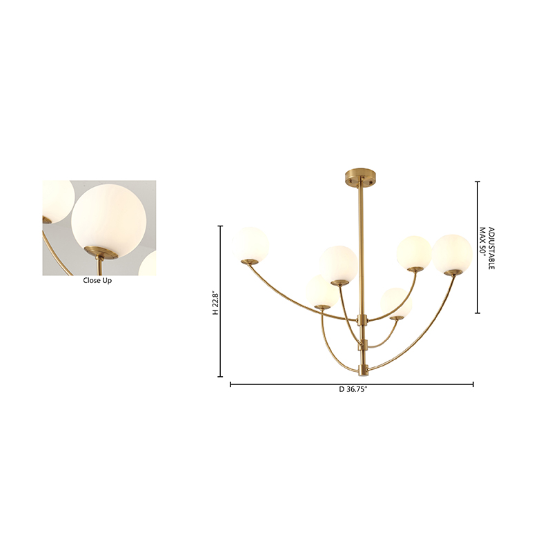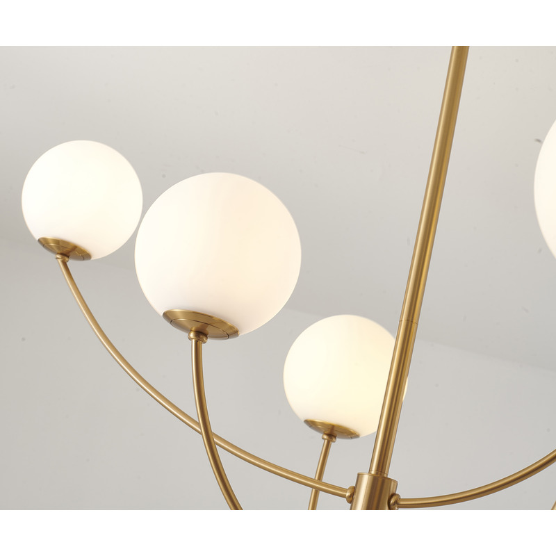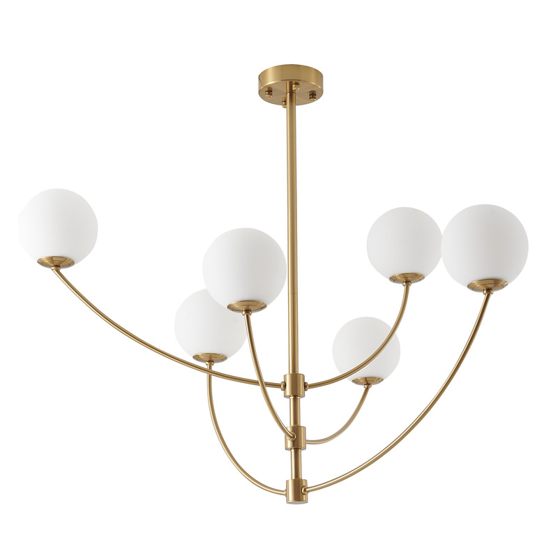 A BRASS ARMED FRAME CHANDELIER WITH WHITE GLASS SHADES